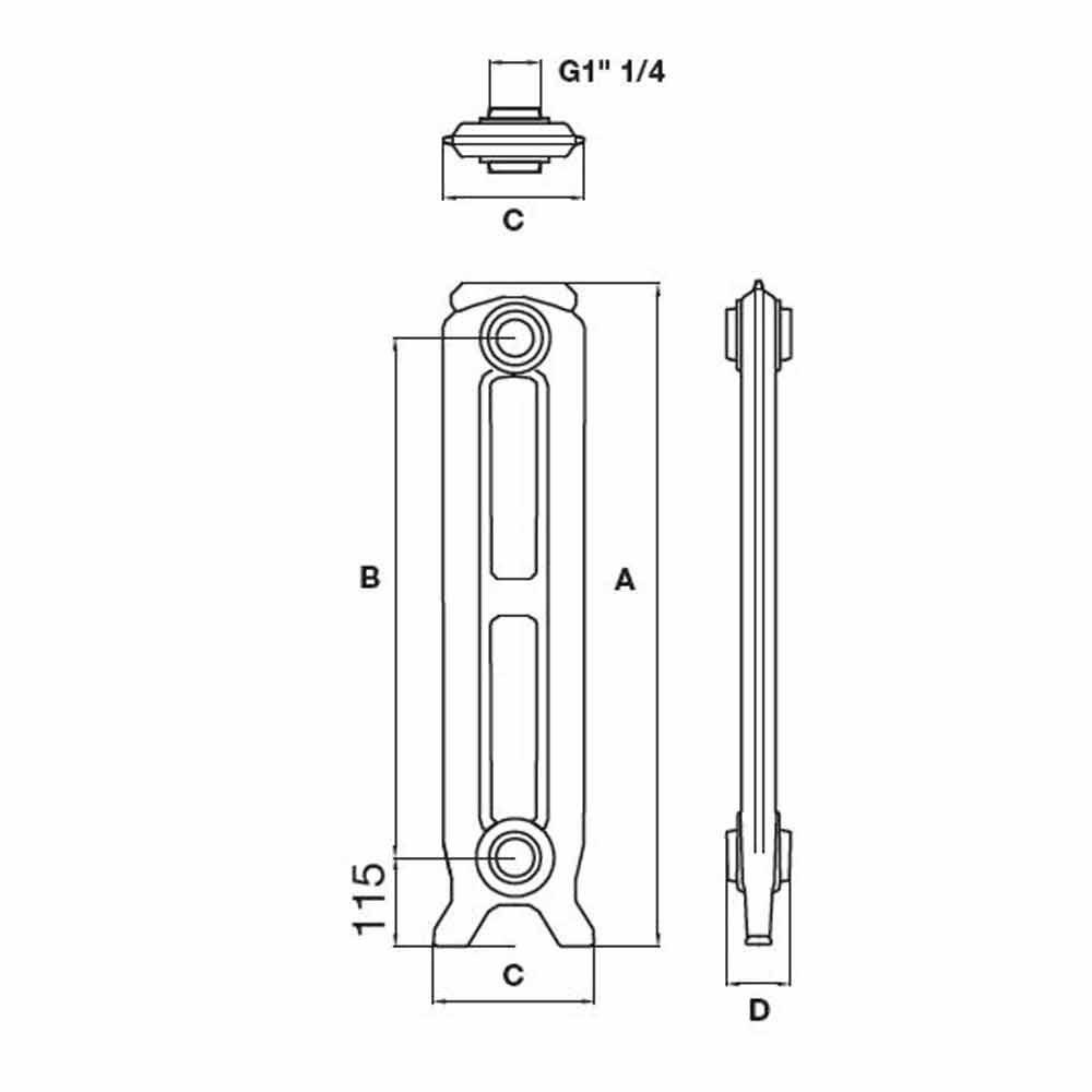Es sind andere Größenvarianten erhältlich, die durch eine Baugruppe in Batterien mit 3 bis maximal 16 Elementen realisiert werden und zwischen 2 oder 3 dekorierten Säulen ausgewählt werden können. Beinhaltet Seitenfüße und Rostschutzgrundierung.