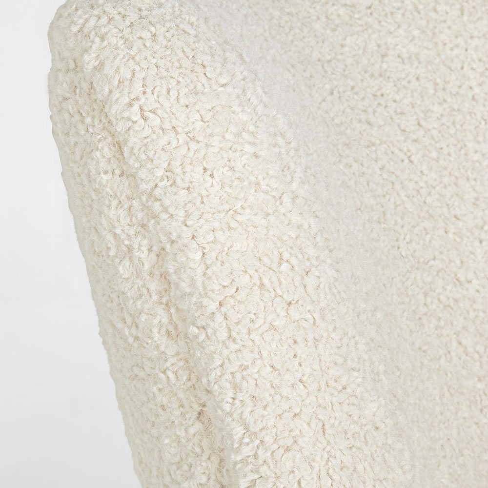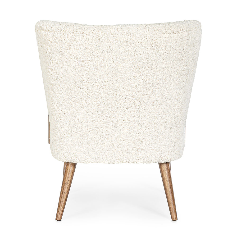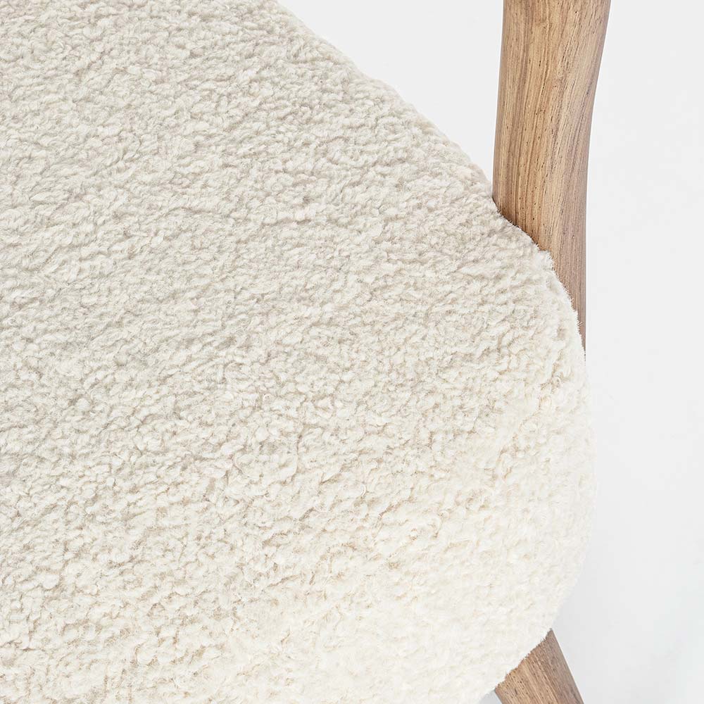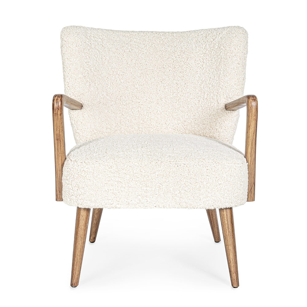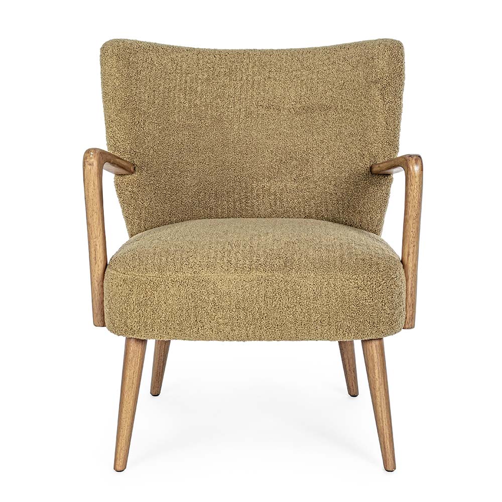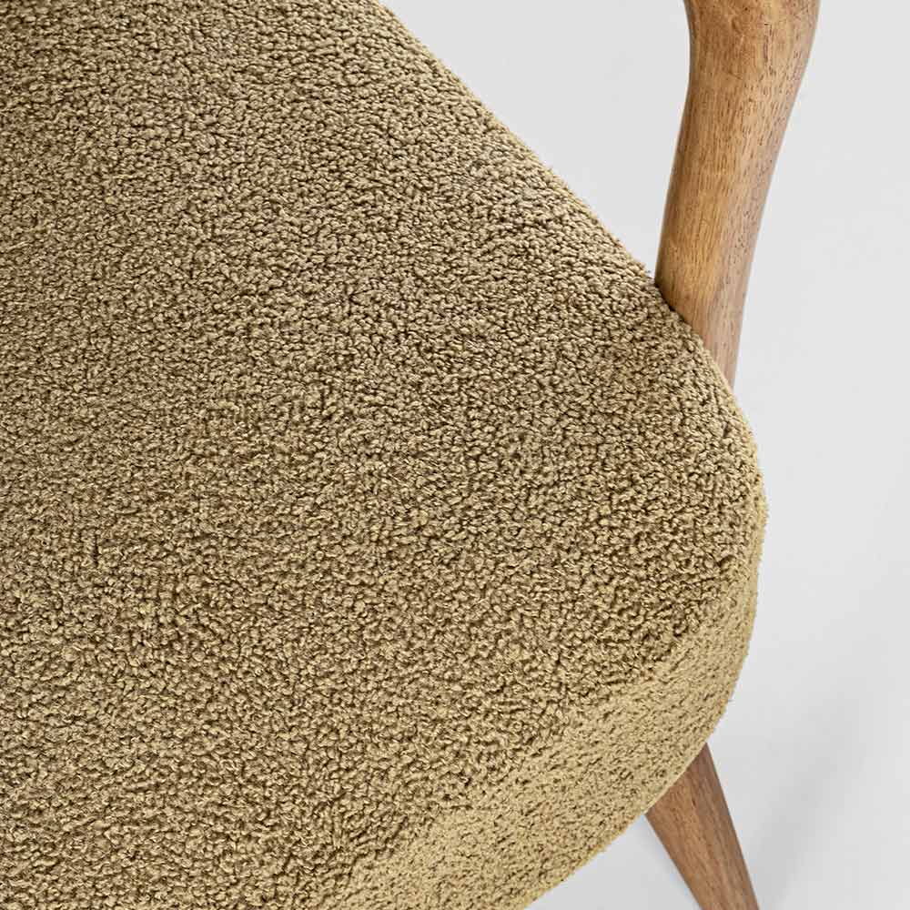 Sessel mit Holzbeinen und -armlehnen, Sitz mit 2-Finish-Wolleffekt.