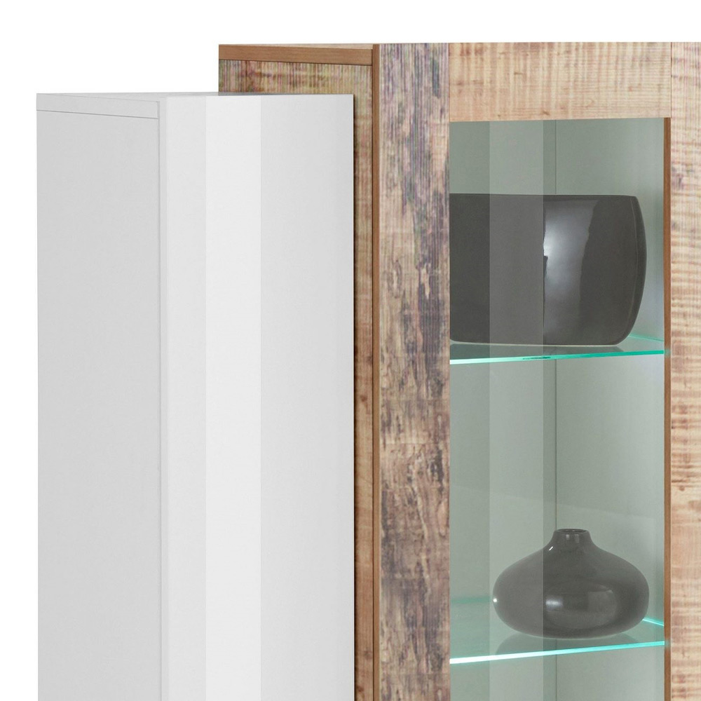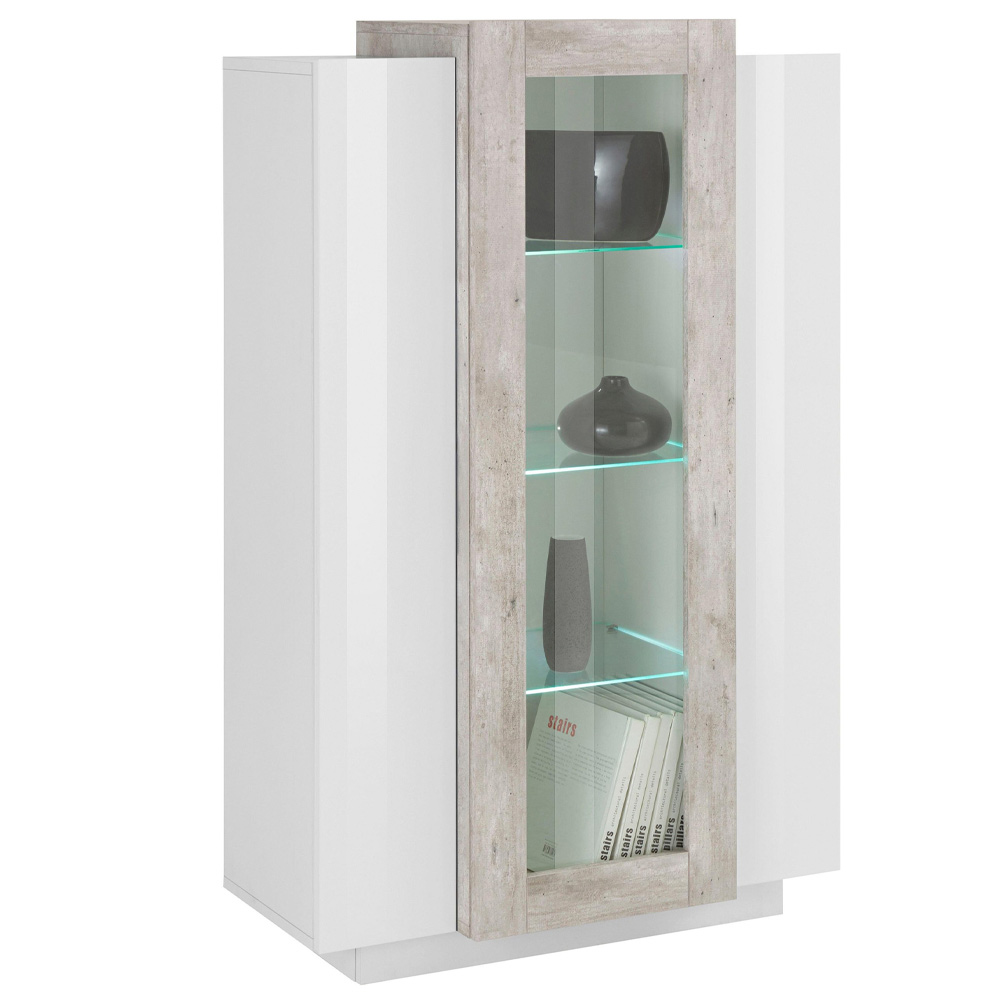 Die Vitrine für das Wohnzimmer zeichnet sich durch ihr schlichtes und schlichtes Design aus, erhältlich in verschiedenen Ausführungen und optional mit 3 weißen LED-Leuchten für das Glas mit Schuko-Steckdose und inklusive Trafo.