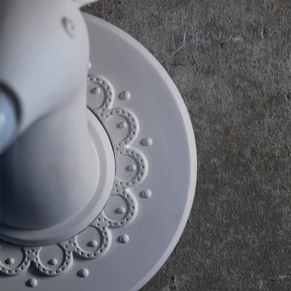 Die Lampe ist aus undurchsichtiger weißer Keramik als Material, das den Ursprung darstellt, die Formbarkeit, die Schaffung und das führt direkt zu den Ursprüngen unserer Kultur.