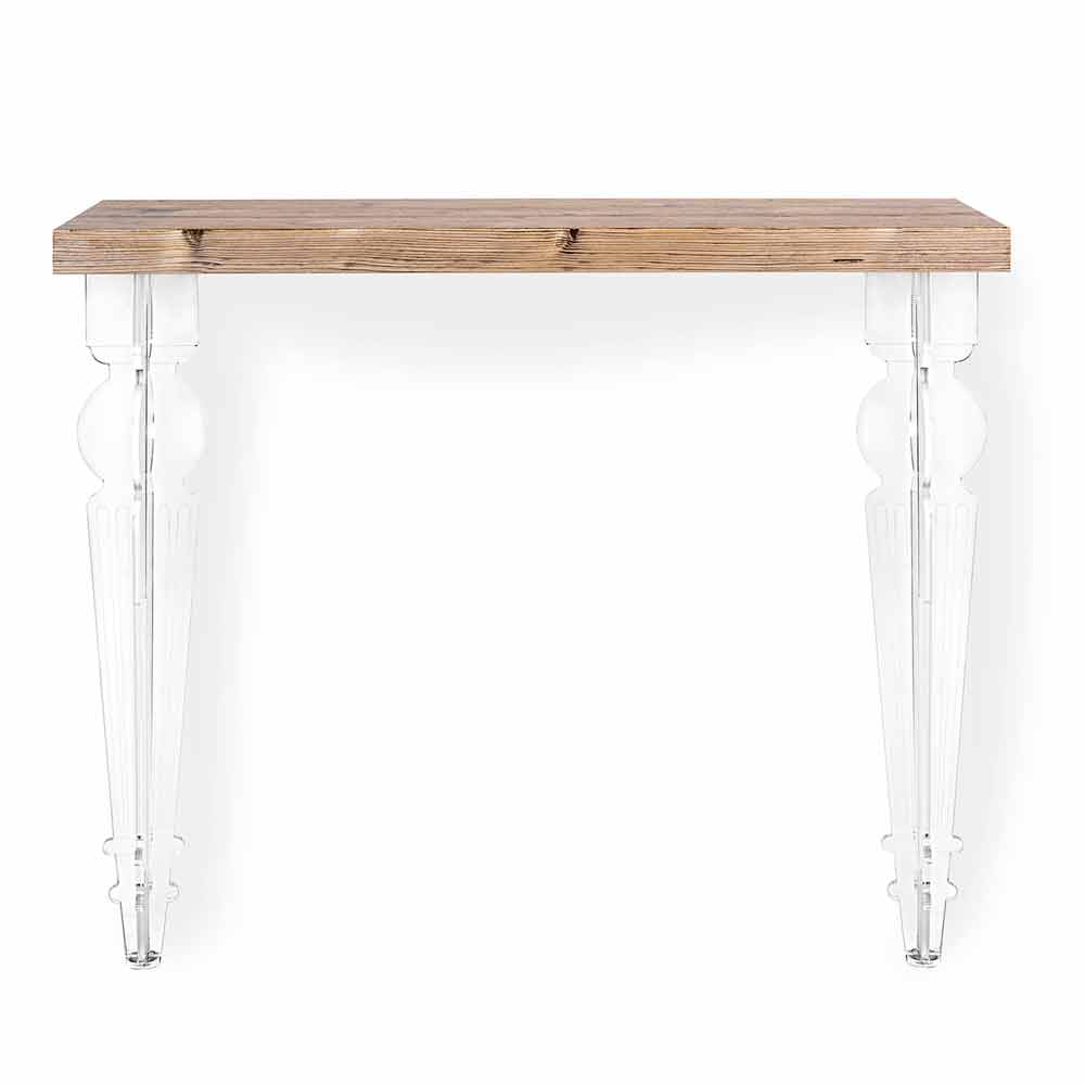 Die gedrehten Beine aus transparentem PMMA-Plexiglas aus jungfräulichem Polymer, deren Helligkeit und Brillanz im Laufe der Zeit garantiert sind, werden mit der geadelten Holzessenz der Oberseite kombiniert, mit einem natürlichen, matt gebürsteten Finish.