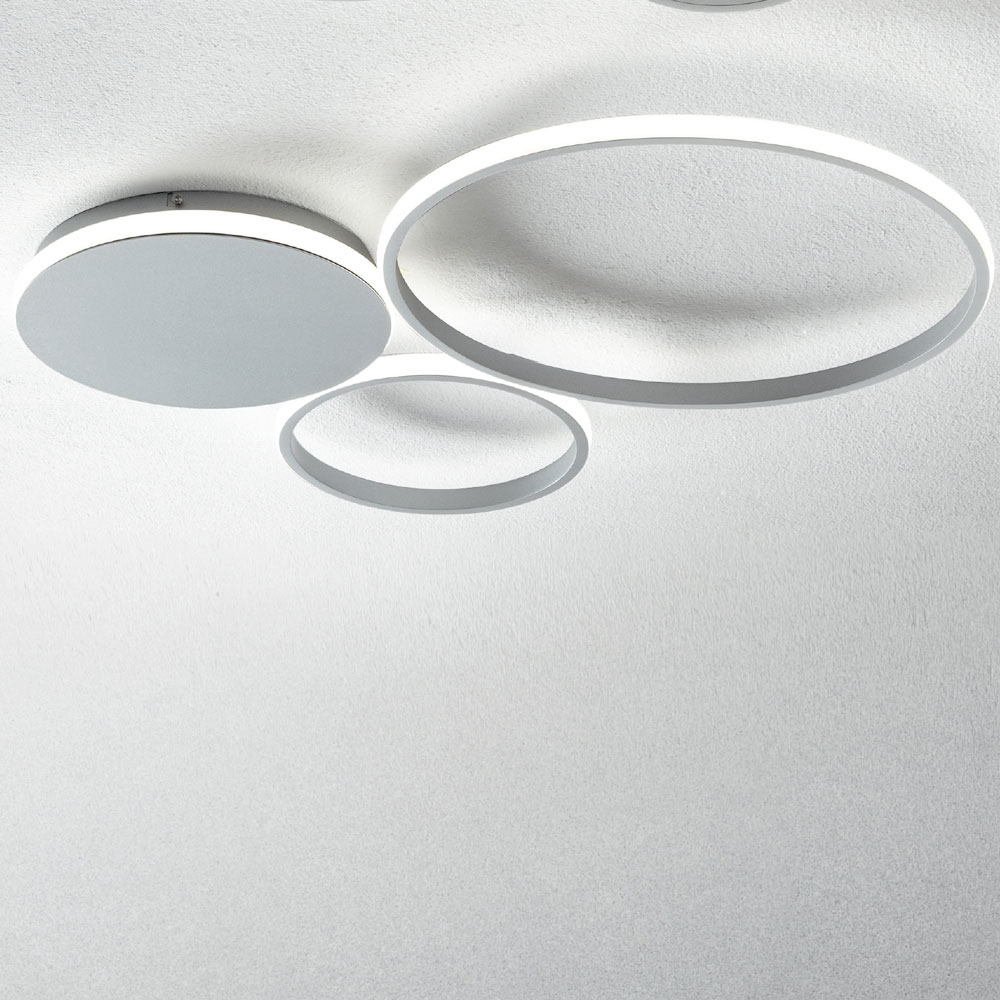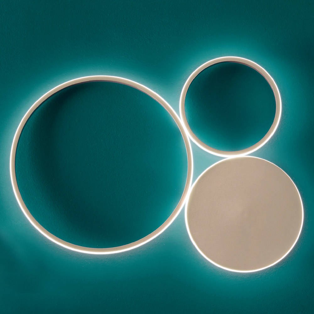 Wandleuchte aus lackiertem Metall mit integrierten dimmbaren LED - Quelle gemacht. Ein Möbelstück mit vielseitigem Charakter , das in jeder häuslichen Umgebung installiert werden kann: Eingang, Küche, Wohnbereich, Schlafzimmer. Eine originelle Komposition aus Kreisen unterschiedlicher Größe, die zusammengefügt und außen von einem milchig-weißen Diffusor bedeckt sind, der den LED-Streifen umschließt und wunderbare Lichteffekte an den Wänden für ein Ergebnis mit starker szenografischer Wirkung erzeugt . Dank seiner kreativen Persönlichkeit und seiner modernen Seele wird es gleichzeitig eine hochwertige Beleuchtung und ein einzigartiges Dekorationselement bieten, das die Wände des Hauses mit einer exklusiven Note bereichern kann. Ihre Form ermöglicht es auch, sie als klassische Deckenleuchte an der Decke zu installieren, was sie noch vielseitiger macht.
