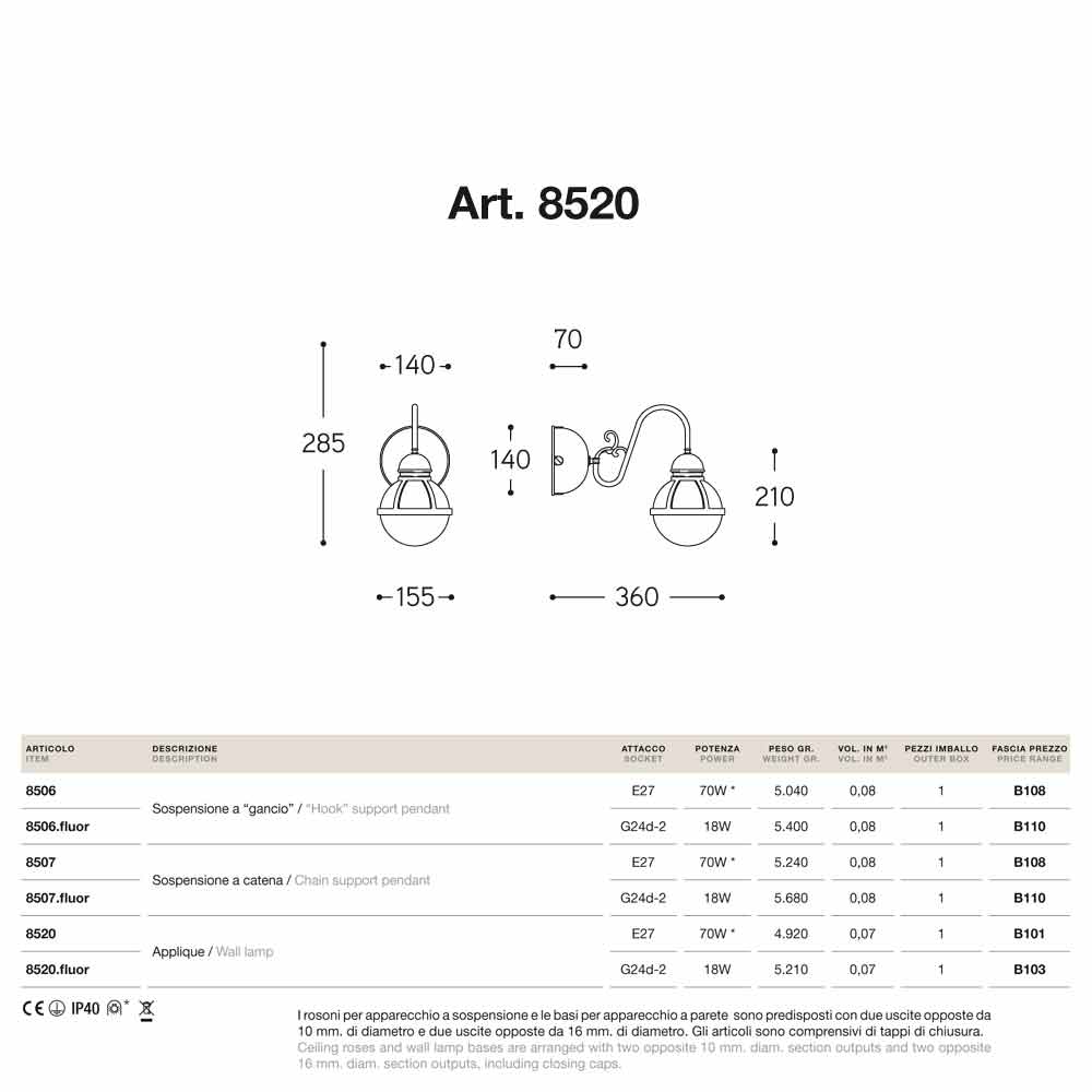 Cimosa ist mit verschiedenen Steckdosen erhältlich: - Gerät mit Fassung für Glühbirne E27 - 70 W - Gerät mit Fassung für Kompaktleuchtstofflampe G24d-2- 18 W Glühbirne nicht enthalten