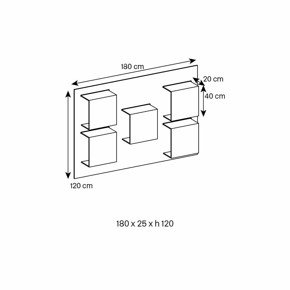 Er besteht aus einer Holzplatte in Nussbaum Canaletto mit 5 transparenten Glasböden und ist in horizontaler oder vertikaler Ausführung erhältlich.
