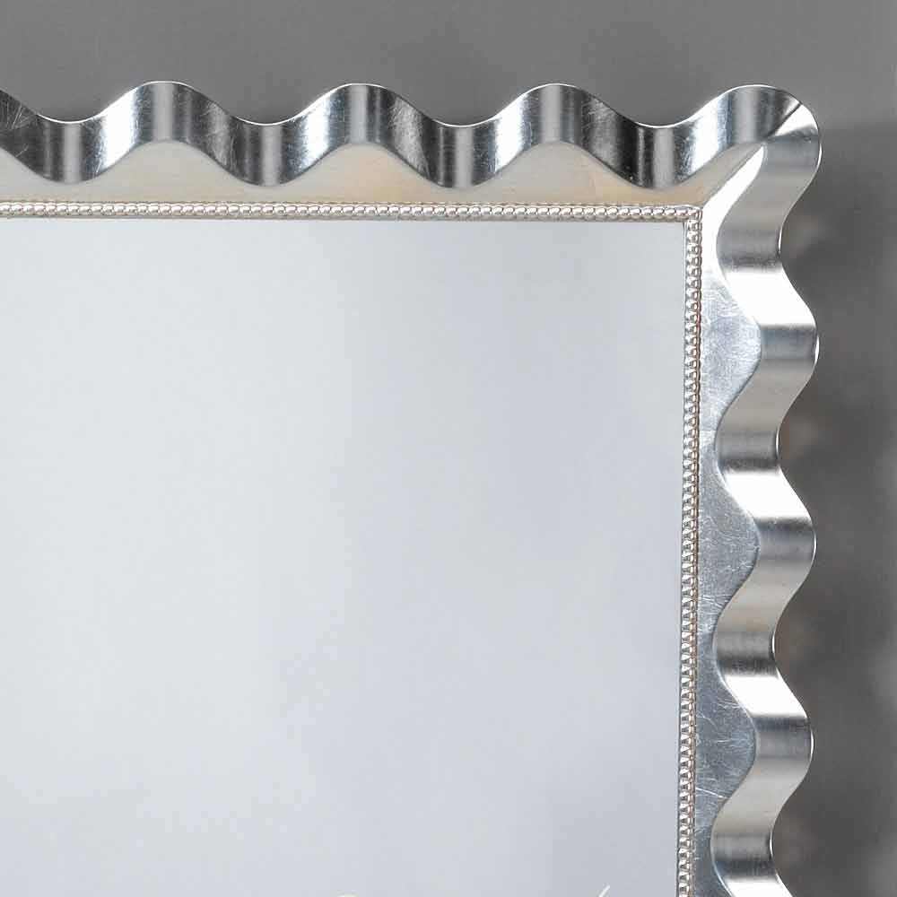 Der Spiegelrahmen besteht aus Holz und wurde mit einen silberbeschichteten wellenförmigen Spiegelrahmen im Glamour Effekt gestaltet. Der Spiegelrand wurde außerdem mit kleinen Details, wie mit Extra Perlen effektvoll gestaltet. Ein hochwertiger Kristallspiegel mit dekorativen Facettenschliff - der Spiegel hat eine Dicke von 4 mm. Made in Italy. Der Spiegel kann sowohl vertikal als auch horizontal aufgehangen werden.