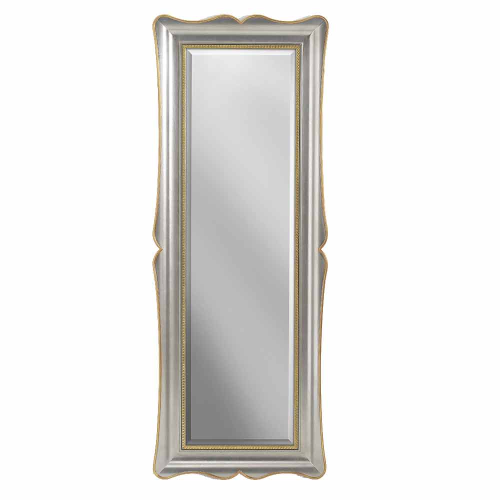 Dieser Spiegel ist ein Beispiel zeitloser Eleganz und kombiniert klassische Oberflächen mit raffinierten goldenen Details. Er ist die perfekte Wahl, um jedem Wohnraum einen Hauch von Luxus zu verleihen. Sein schlankes, längliches Design wird von einem Rahmen mit sanft gewellten Kanten eingerahmt, was dem Ensemble ein Gefühl von Bewegung und optischer Anmut verleiht.
