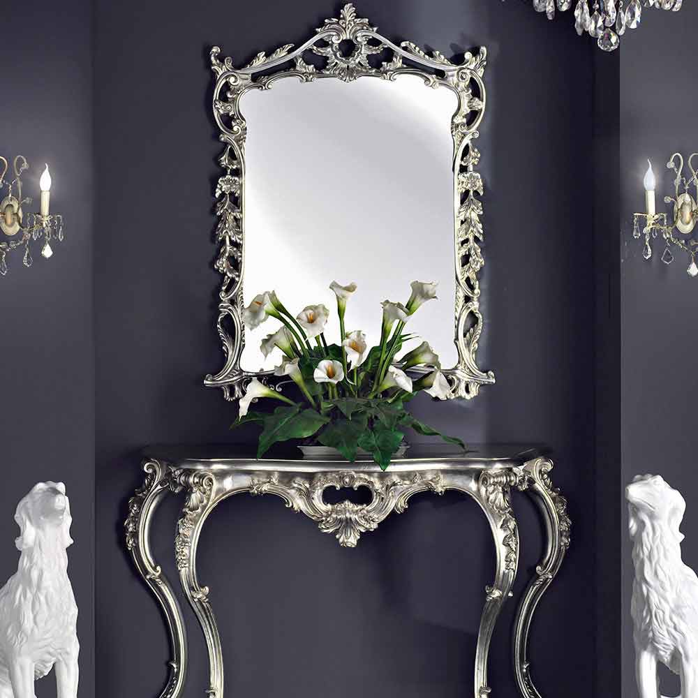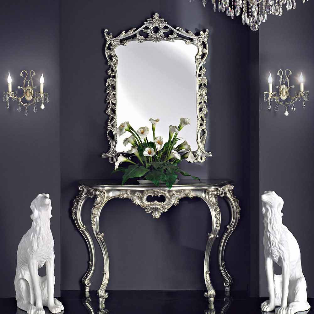Pracht des italienischen Barockdesigns in diesem prächtigen Spiegel mit Konsole. Jede Kurve und jeder Fries wurde fachmännisch geformt, um das Licht einzufangen, den Blick zu verzaubern und den Spiegel in ein wahres Kunstwerk zu verwandeln. Über der Konsole vergrößert der Spiegel nicht nur den Raum, sondern spiegelt auch die Schönheit der Umgebung wider.
