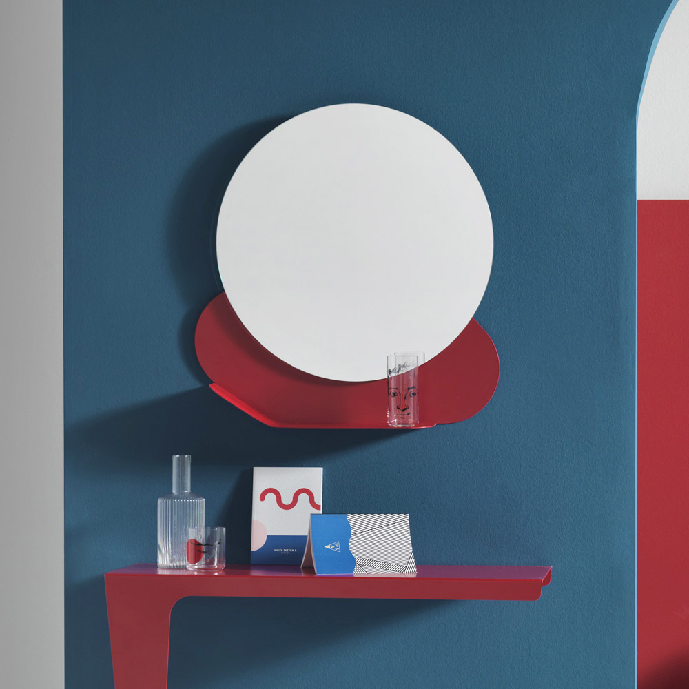 Dieser moderne Wandspiegel passt dank des unteren Regals aus farbigem Metall mit lebendigen und zeitgemäßen Farben in junge Kontexte, das die runden Formen des Spiegels begrenzt und Kontinuität mit der Umgebung schafft. Ein praktisches und funktionales Produkt mit einem originellen und funkelnden Design, das verschiedene Kontexte charakterisieren kann, vom Eingang zum Wohnzimmer sowie im Badezimmer oder Schlafzimmer.