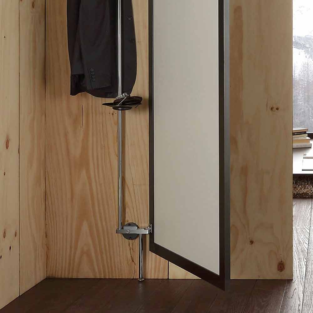 Innovativer Wandspiegel aus Rauchglas mit Öffnung aus Italien mit schwarz lackiertem Metallrahmen und verchromtem Metallwandsystem mit 3 Kleiderhaken und praktischer Aufbewahrungsplatte. Ein äußerst einfaches und wesentliches Design wird mit einer originellen und innovativen Idee kombiniert, wodurch eine funktionale Einrichtungslösung zum Leben erweckt wird, die sich an jede Umgebung anpassen kann, in der ein verborgener Raum für die Organisation verschiedener Objekte geschaffen wird. Die Struktur ist für die Eckbereiche des Hauses konzipiert, die häufig nicht genutzt werden, aber in praktische Bereiche umgewandelt werden können, in denen Taschen, Mäntel und mehr platziert werden können, um eine saubere und ordentliche Umgebung zu gewährleisten.