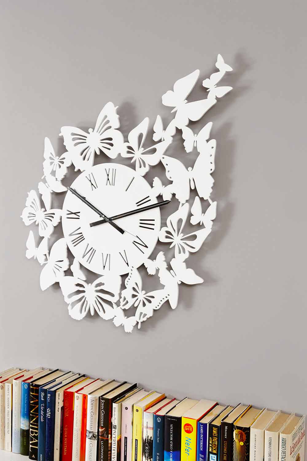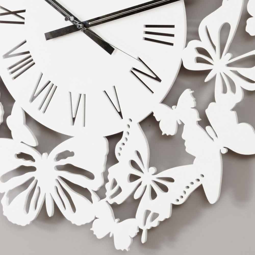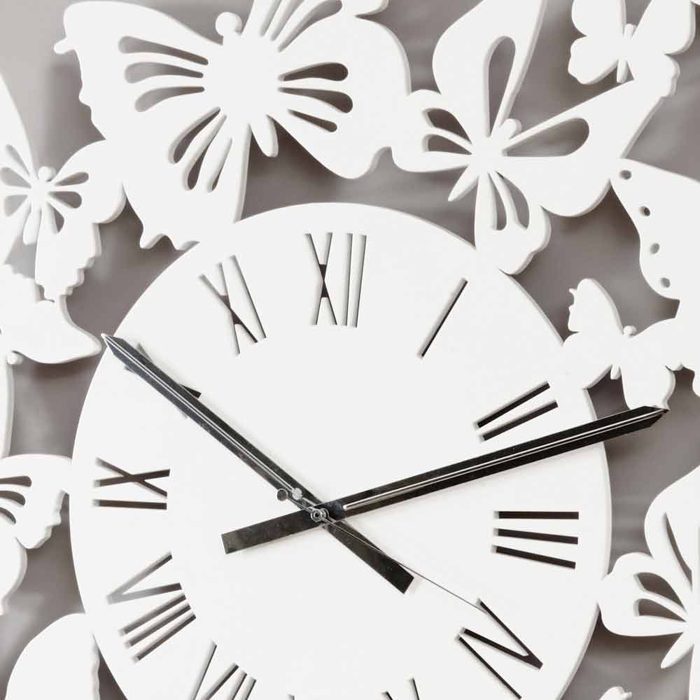 Große Wanduhr aus weißem, schwarzem, taupefarbenem, beige oder braunem Holz, rundes Design mit Schmetterlingen aus Italien.