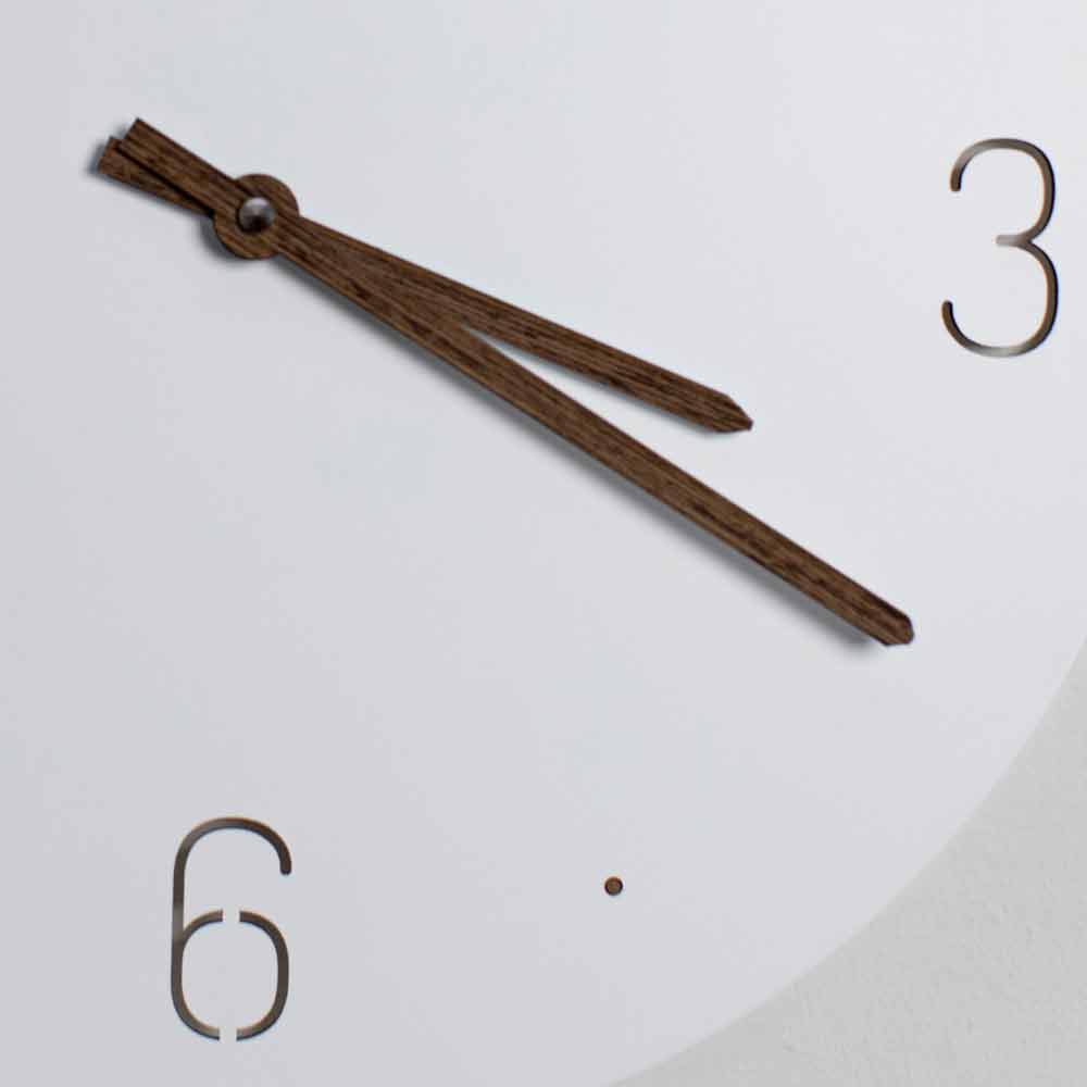 Eine runde Uhr mit einfachen und klaren Linien in opakem Weiß für ein klassisches und einfaches Design mit Walnusszeigern.
