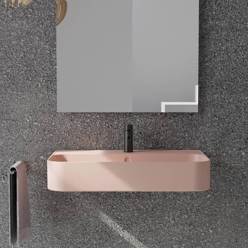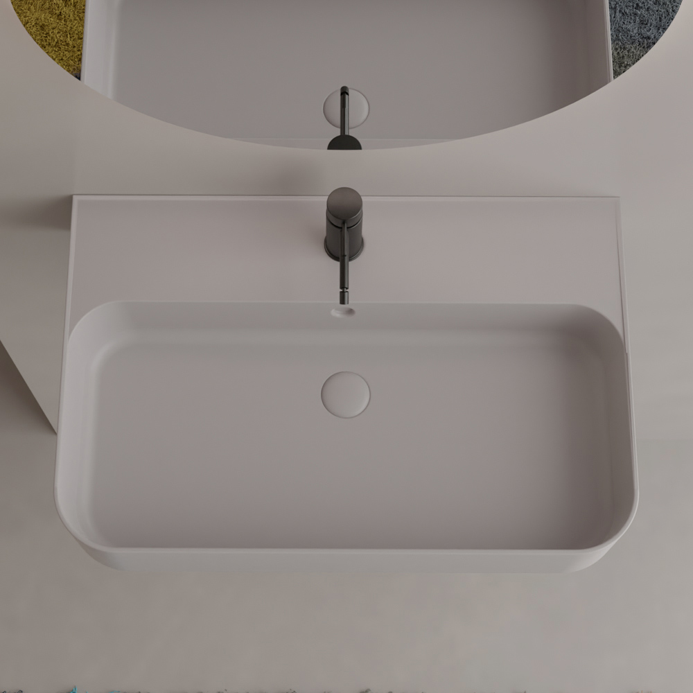 Die Farben und die elegante rechteckige Form drücken eine schlichte, aber kraftvolle Schönheit aus und verleihen dem Waschbecken ein ebenso praktisches wie ästhetisch ansprechendes Aussehen. Die hochwertige Keramik sorgt für Widerstandsfähigkeit und Haltbarkeit im Laufe der Zeit und behält ihr makelloses Aussehen bei einfacher Wartung.