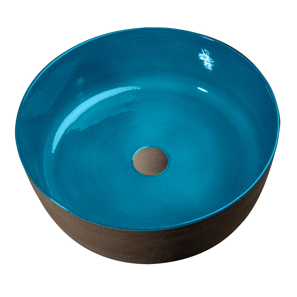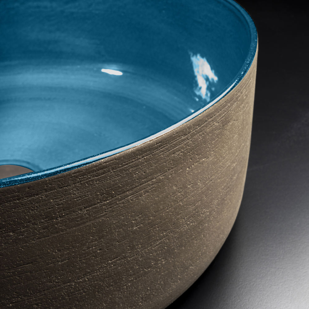 Rundes Aufsatzwaschbecken , vollständig in Italien aus feuerfestem Ton hergestellt, von Hand gedreht mit drittem Feuerkochen. Seine Ästhetik zeichnet sich durch die perfekte Kombination aus dem natürlich gewachsten und wasserdichten Äußeren mit einem rustikaleren Stil und dem glänzenden und glasierten blauen Interieur mit einem eleganteren und raffinierteren Geschmack aus. Jedes Element des Waschbeckens wird von Hand gefertigt , um eine exklusive Einrichtungslösung von hohem Wert und unvergleichlicher Qualität zum Leben zu erwecken.