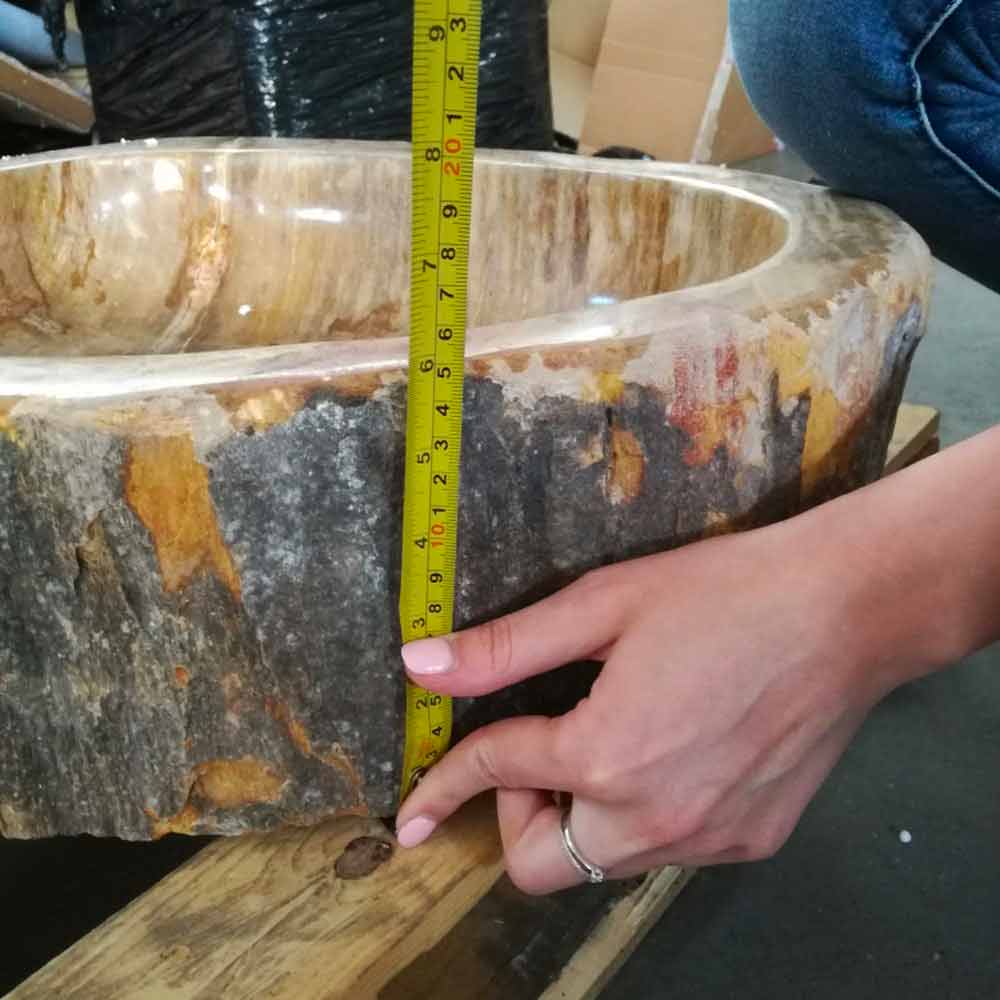 Versteinertes Holz fand man überwiegend in der Nähe von Vulkanen, Holzstämme, die durch den Staub und die Asche der Vulkanausbrüche, von über Millionen von Jahren bedeckt und besiegelt worden sind. Das Holz versteinerte im Laufe der Jahrtausende durch den folglichen Sauerstoffmangel und bevölkert damit heute mit seinen außergewöhnlichen Design viele unserer Badezimmer. Indonesische Waschbecken aus fossilem Holz sind eine echte Rarität und ein einmaliges Unikat in seiner Verarbeitung. Kein einziges Waschbecken aus Fossilholz gleicht den anderen, jedes Unikat besitzt seinen eigenen und persönlichen Look und bereichert Ihr Bad mit seiner ganz persönlich jahrhundertlangen Geschichte. Erleben Sie die Einzigartigkeit der Natur !