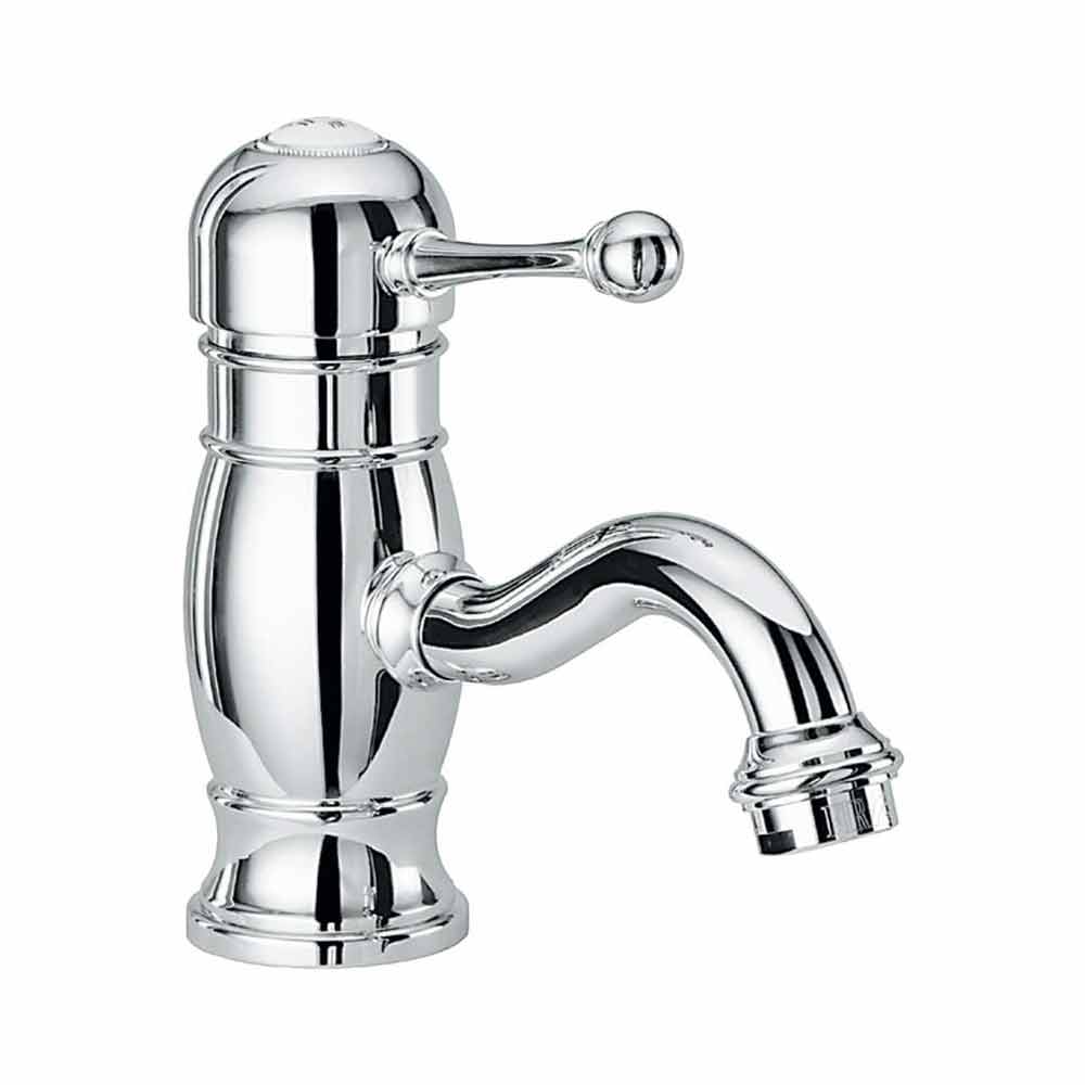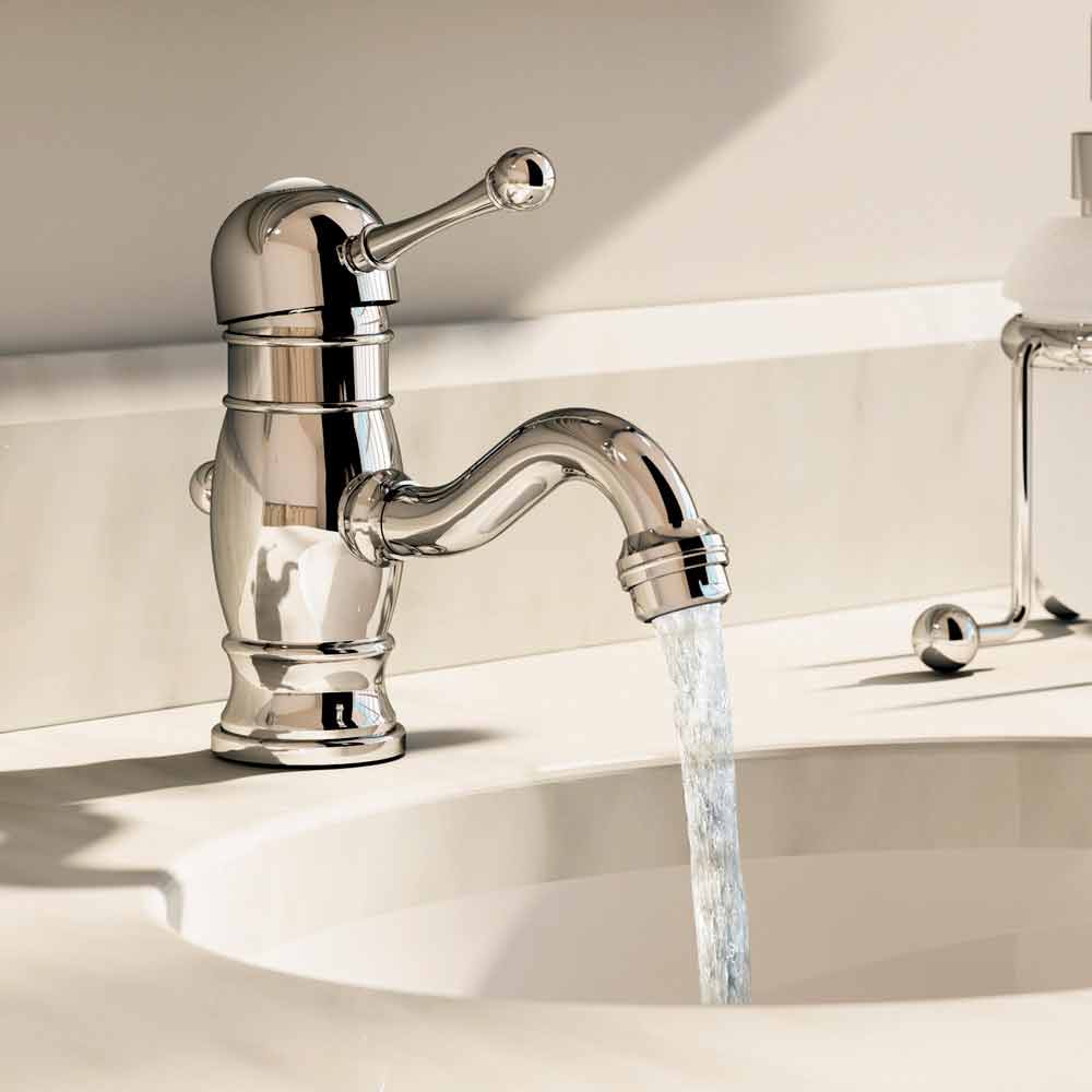 Arbeitsmischer im klassischen Design aus verchromtem Messing ; 150 mm hoch und mit einem Radstand von 130 mm, mit Ablauf- und Aufstellmechanismus. Komplett in Italien hergestellt mit hochwertigen Materialien, die den europäischen Standards entsprechen. Dieser Mischer kann oben installiert werden und ist mit einem Belüfter und einer Keramikscheibenpatrone ausgestattet. empfohlen für sein Energiesparsystem zur Wassereinsparung von 6 l / min und für seine starren Anbaugeräte.