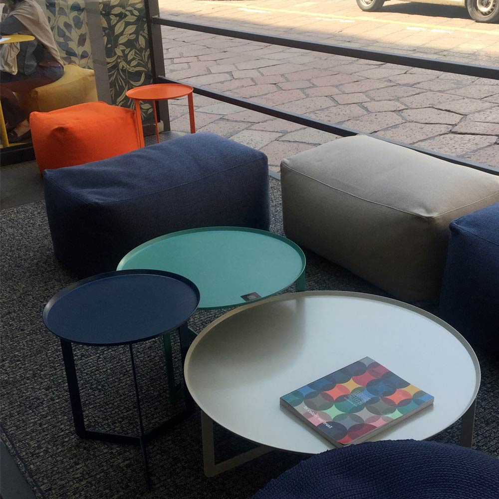 Weicher Hocker für das Wohnzimmer im Innen- oder Außenbereich aus farbigem Stoff in verschiedenen Ausführungen, hochwertige Made in Italy.