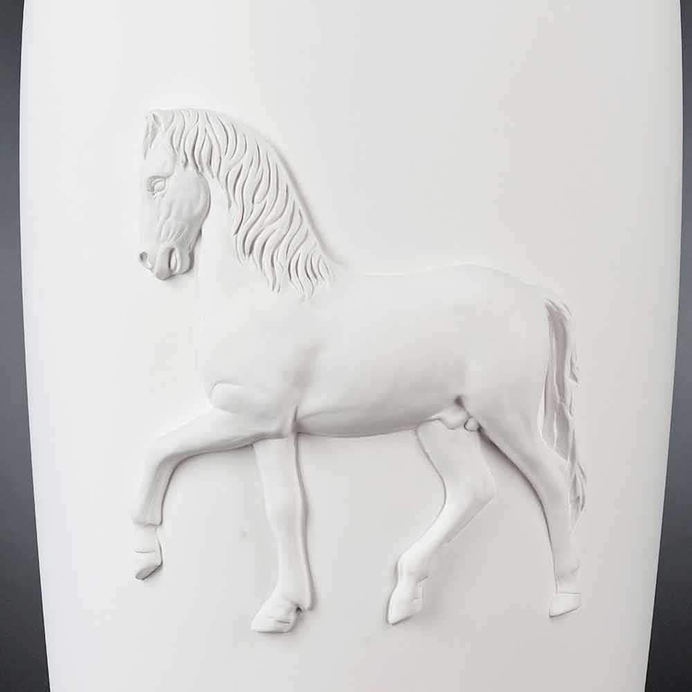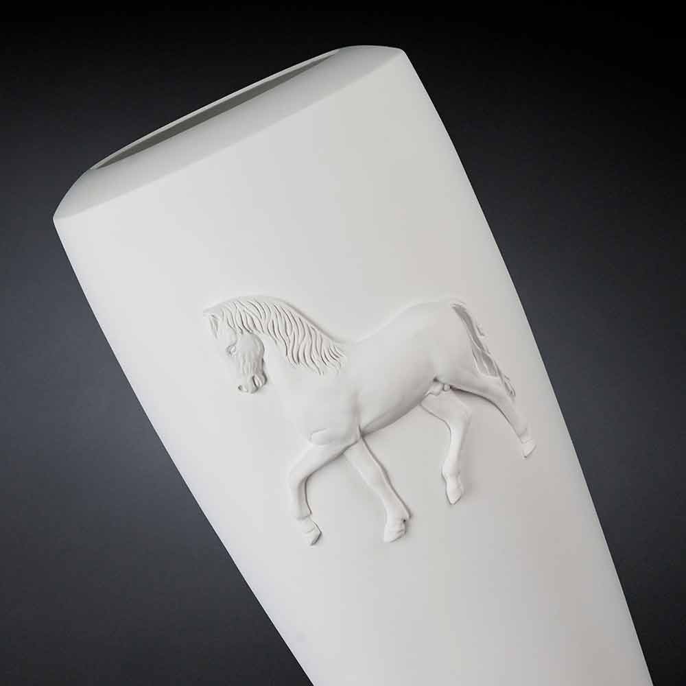 Weiße Keramikvase Carlos, 100% Made in Italy, modernes Design. Dekorative Keramikvase, handgefertigt von italienischen Handwerkern, die sich durch ein modernes Design auszeichnet. Auf der Oberfläche ist ein Pferd geprägt. Es ist ein 100% Made in Italy Produkt. Carlos ist in mehreren Ausführungen erhältlich. Fordern Sie ein Angebot unter info@viadurini.co.uk an.