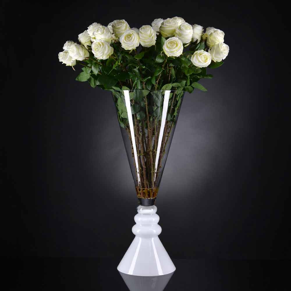 Indoor-Vase aus transparentem Glas mit weißem Boden, hergestellt mit einer 100% Made in Italy Verarbeitung . Eine Ergänzung, die sich durch eine einfache und klare Ästhetik auszeichnet, die durch extreme Eleganz und vielseitige Oberflächen unterstrichen wird, die es ermöglichen, in jeder Umgebung mit einem raffinierten Stil verwendet zu werden . Ein ideales Design für die unterschiedlichsten Umgebungen, von der Wohnungseinrichtung bis hin zu Hotels, Restaurants, Objektbereichen, Spas, aber auch als Rahmen für Veranstaltungen und Hochzeiten.