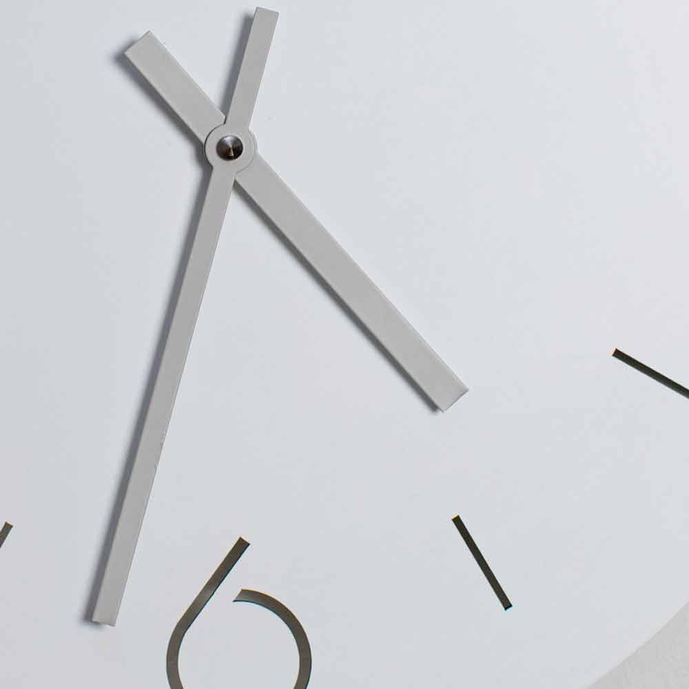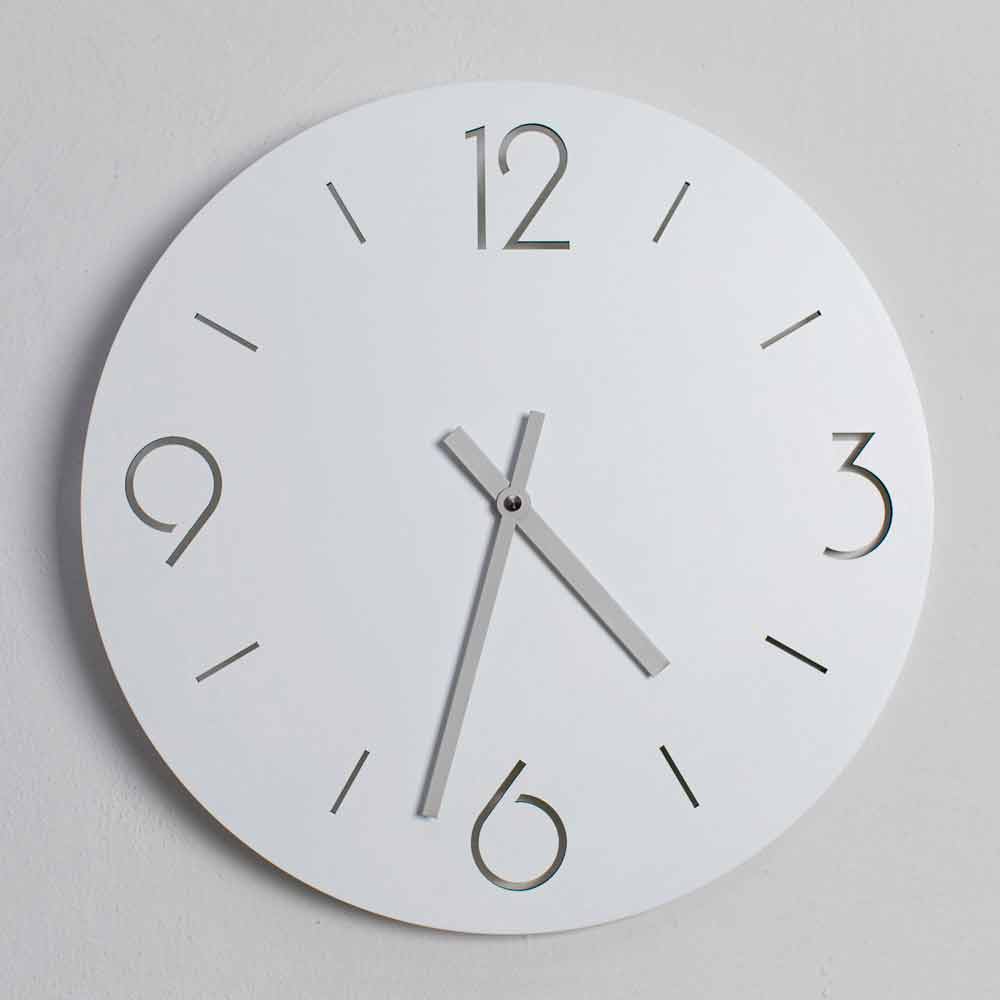 Grundlegende und runde Wanduhr aus weiß lackiertem und lasergeschnittenem Holz, hergestellt in Italien.