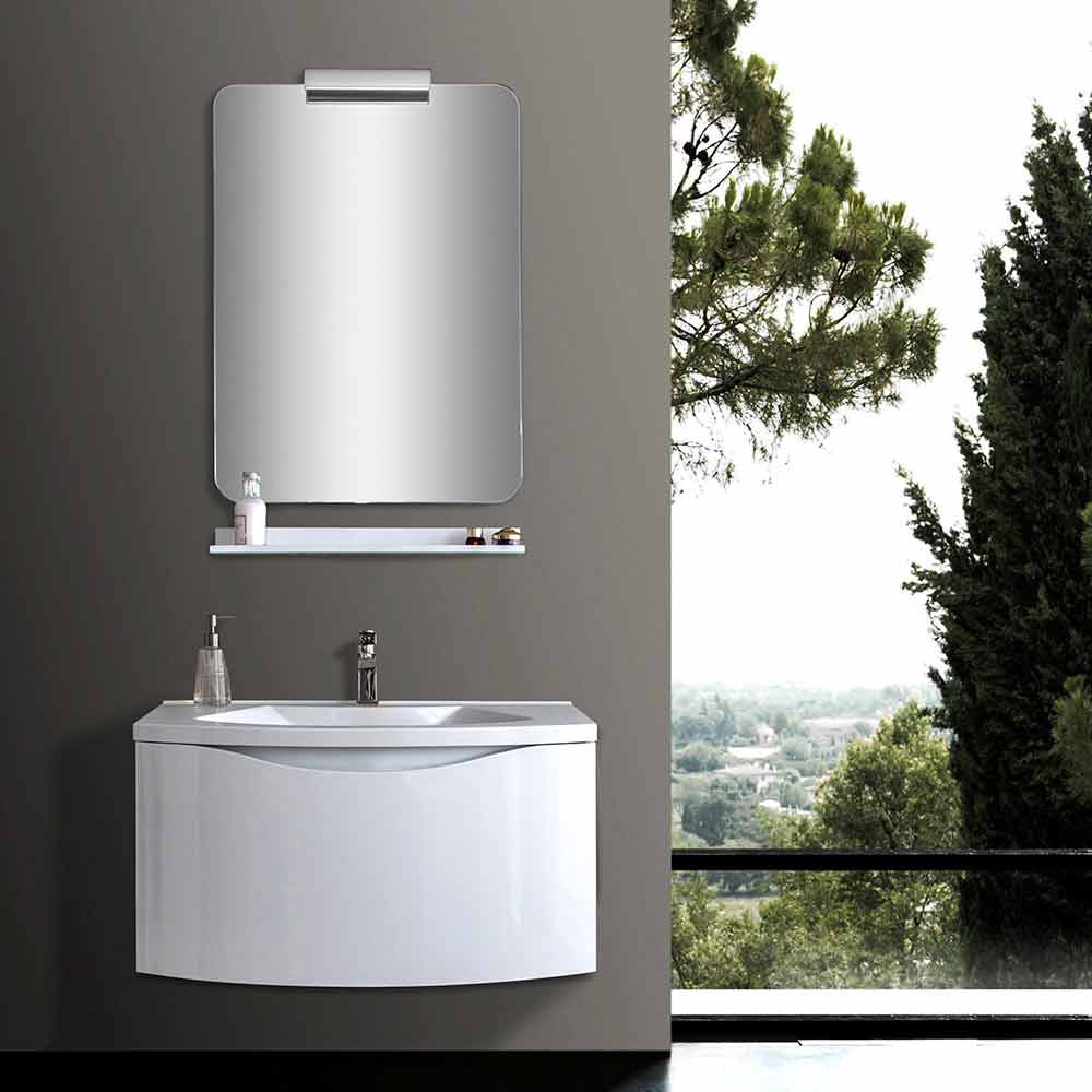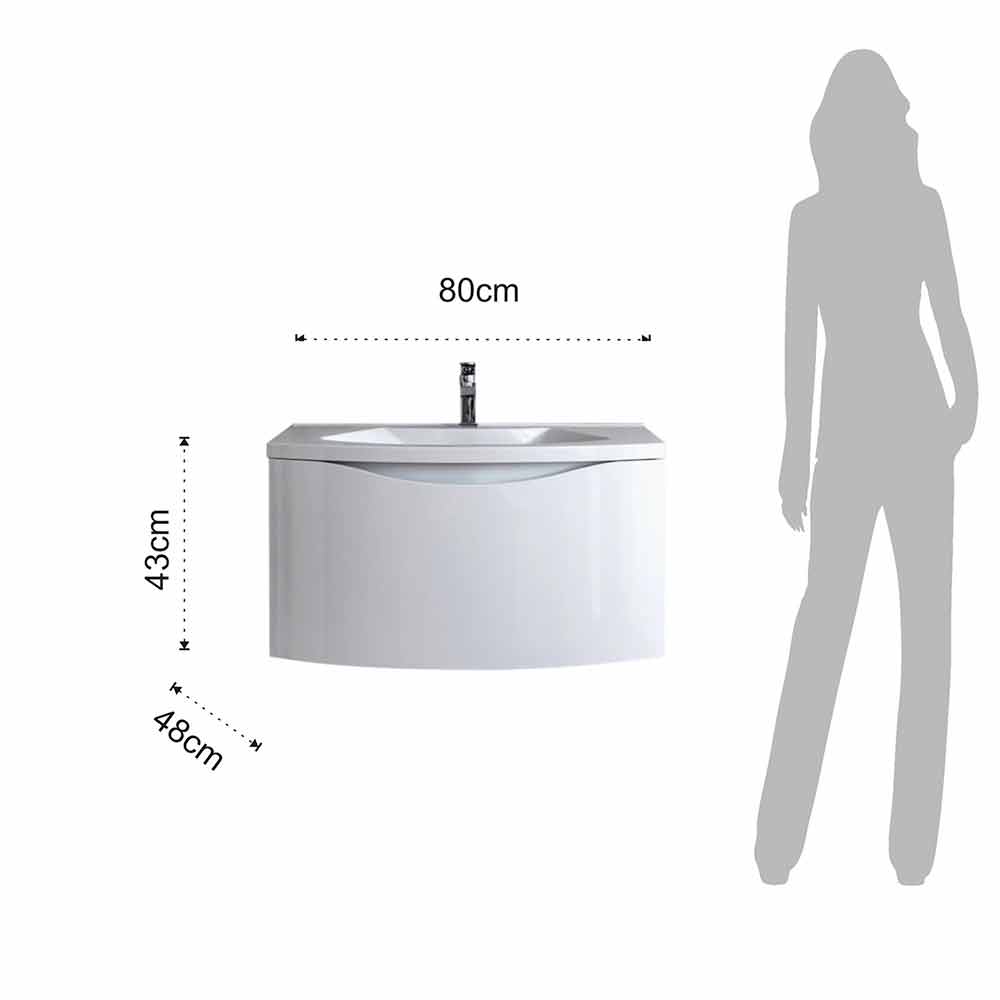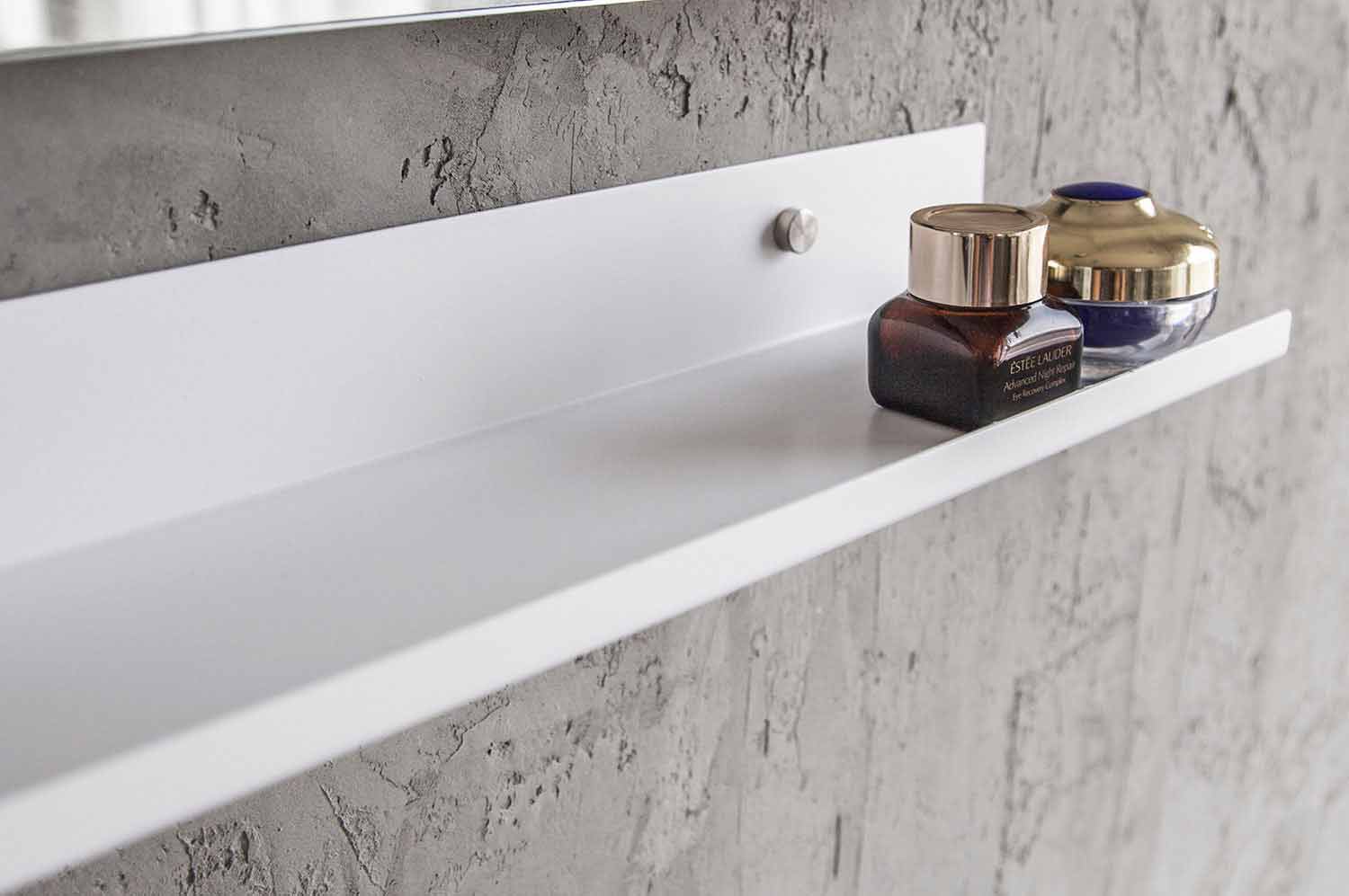| Maße | Schrank: L 80 x P 48 x H 43 cm Spiegel: L 60 x H 80 cm Regal: L 60 x P 10 x H 5 cm |