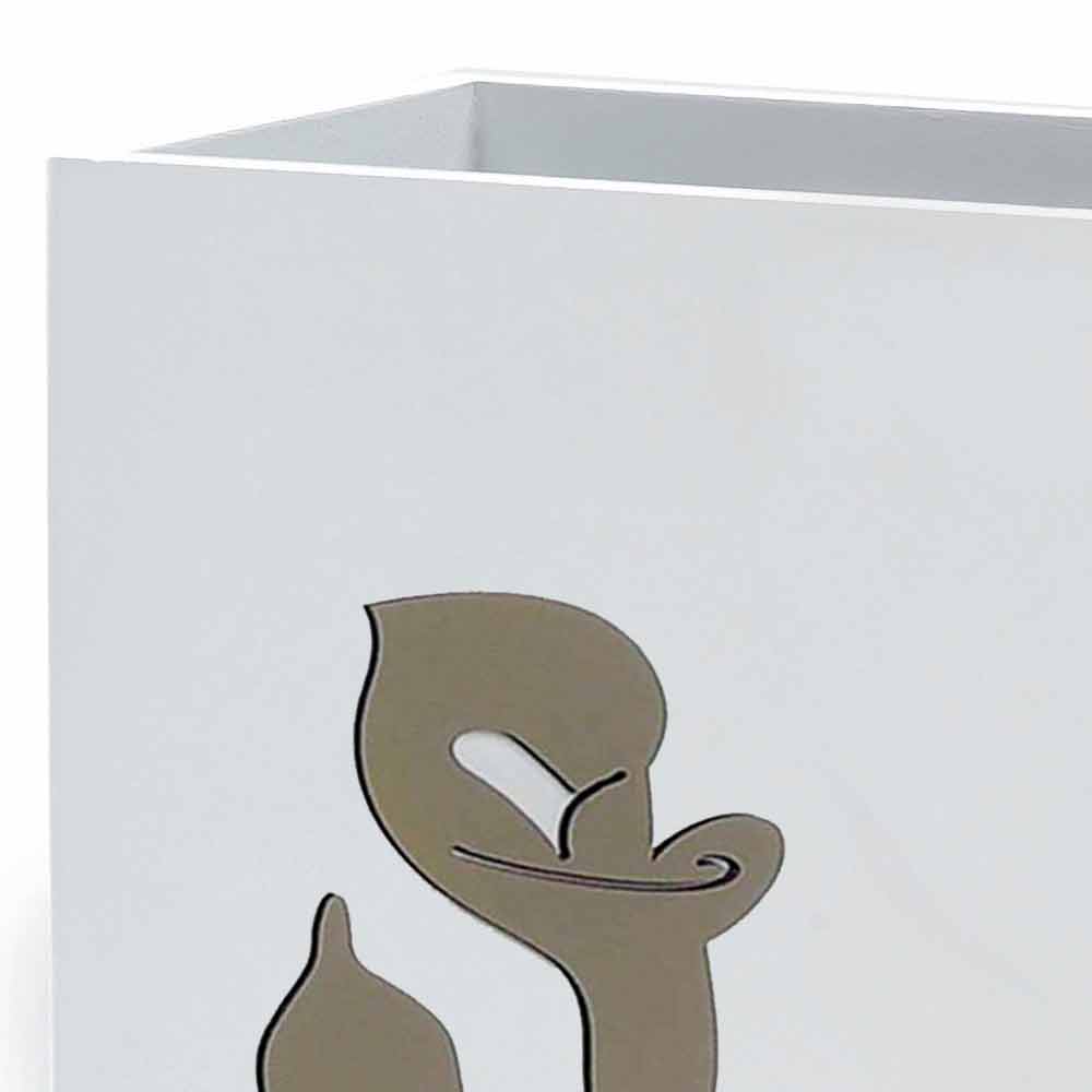 Wählen Sie die klassischste Neuinterpretation des Bodenschirmständers aus lackiertem Holz mit einer Calla-förmigen Blumendekoration in taubengrauer Farbe im Gegensatz zum matten Weiß der Basis. Im Inneren befindet sich ein praktisches Tablett zum Sammeln von Wasser.