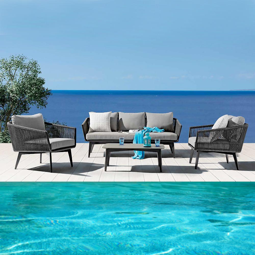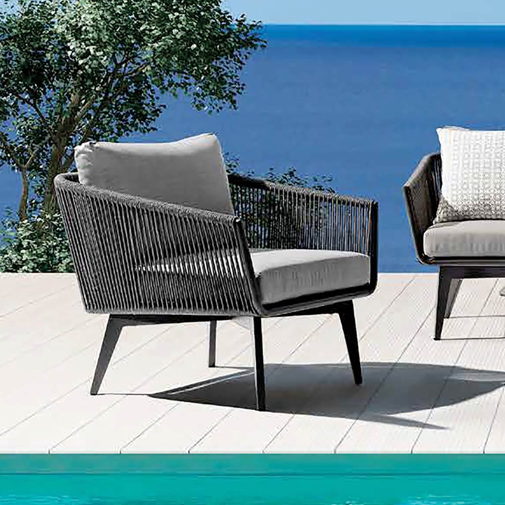 Diese Gartenlounge ist ein perfektes Beispiel für zeitgenössische Eleganz und wurde für ein stilvolles und komfortables Leben im Freien konzipiert. Die solide und leichte Struktur aus lackiertem Aluminium zeichnet moderne und raffinierte Linien, während das seitliche Seilgeflecht für Bewegung und optische Leichtigkeit sorgt und das Ganze raffiniert und einladend macht.