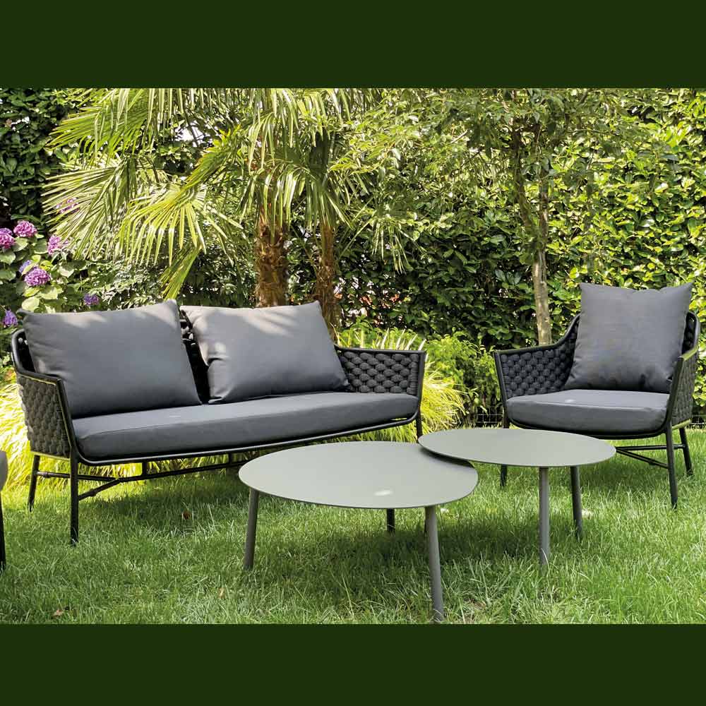 Diese Gartenlounge lädt zum Entspannen ein. Elegantes Design und technische Materialien vereinen sich zu einer eleganten und einladenden Outdoor-Ecke. Die schwarz lackierte Aluminiumstruktur verleiht Stabilität und eine moderne Ästhetik, die perfekt zu den Trends hochwertiger Outdoor-Möbel passt.