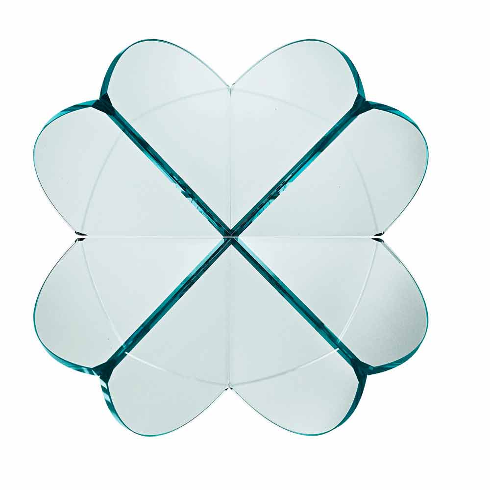 Das Endergebnis ist ein Möbelstück, das an eine kostbare Blume erinnert und vollständig aus gehärtetem Glas mit geätzter Basis besteht.