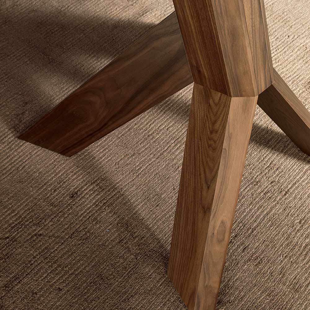 Dieser Esstisch hat eine Struktur mit 4 Beinen aus furniertem Holz mit Canaletto-Nussbaum-Finishund einem transparenten gehärteten Glas geformten Zylinder. Seine Besonderheit ergibt sich aus der Struktur, die, inspiriert von der Natur , an die Form der Wurzeln einer Eiche erinnert, die das ätherische und glänzende Glas der Platte mit großer Kraft tragen soll.