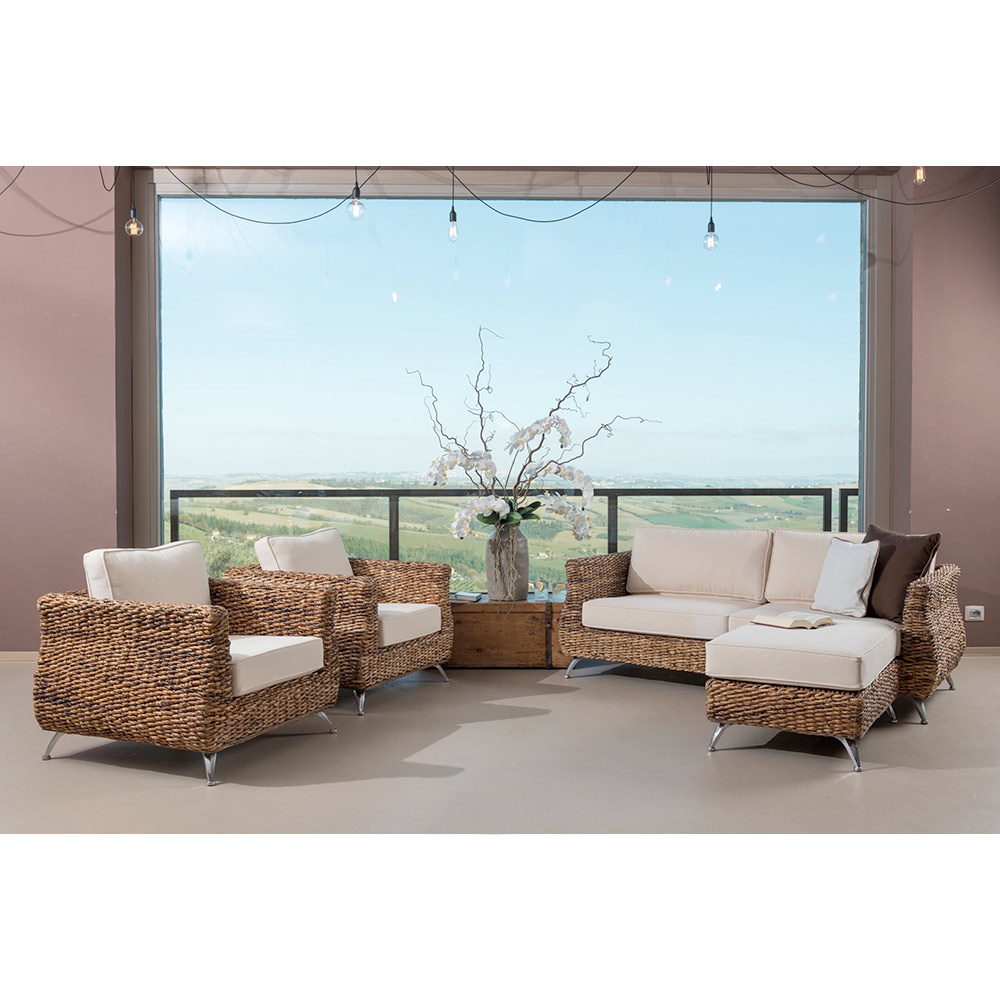 Outdoor Lounge bestehend aus 2Sesseln , einem 3-Sitzer-Sofaund Kaffee-Tisch-Pouf aus natürlichem handgeflochtenem Bananenholz mit Standard-Kisseninbegriffen in der Standard " Ecru " Ausführung.