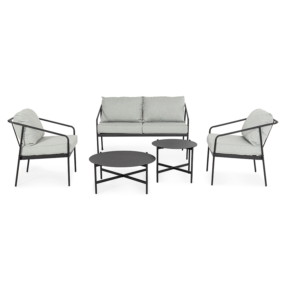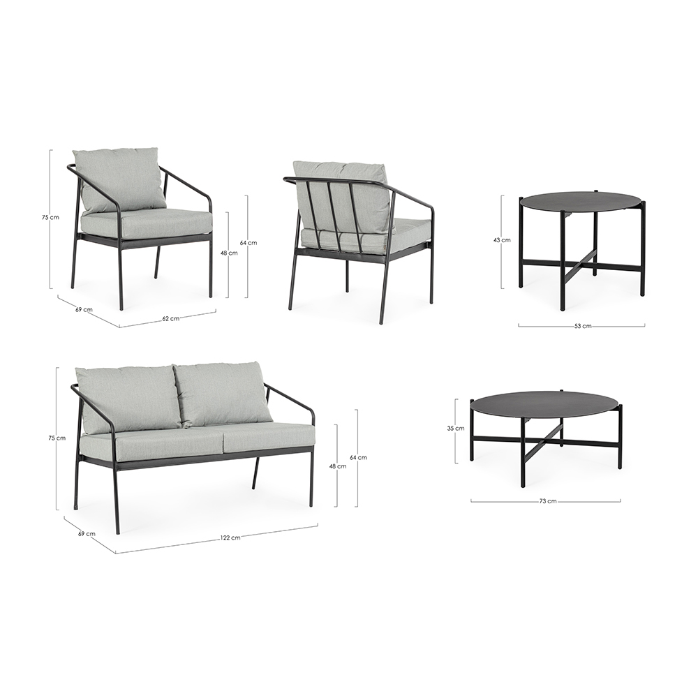Dieses Garten-Lounge-Set ist eine wahre Ode an modernes Design und Komfort im Freien . Jedes Stück, vom Einzelsessel bis zum Zweisitzer-Sofa , wurde so konzipiert, dass es ein unvergleichliches Entspannungserlebnis bietet, da es sich dank der weichen Sitz- und Rückenkissen an jede Landschaft und jeden Stil von Gartenmöbeln anpasst. Die Stahlkonstruktion ist robust und auf Langlebigkeit ausgelegt, doch die geschwungene Form verleiht dem Set eine optische Leichtigkeit, die die Umgebung aufwertet, ohne sie zu beschweren.