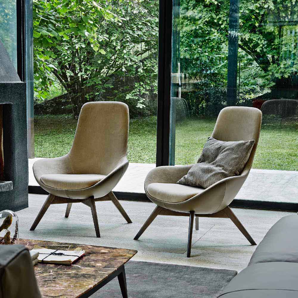 Sein Aussehen erinnert an Linien und Formen der Vergangenheit, die in einem zeitgenössischen Schlüssel überarbeitet wurden, um einem avantgardistischen und besonders innovativen Sitz Leben einzuhauchen. Die Hülle hat ein umhüllendes Design, das einen äußerst bequemen und einladenden Sitz bietet, der perfekt für Wohnbereiche im modernen Stil geeignet ist, um Räume mit einer Ergänzung mit einer eleganten und raffinierten Seele zu füllen, die die gesamte Umgebung mit Persönlichkeit charakterisieren kann.