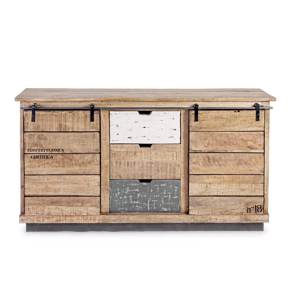 Dieses Design-Sideboard für das Wohnzimmer hat eine Struktur mit 2 Türen und 3 Schubladenaus Mangoholz mit einer Stahlbasis und einer Oberfläche auf Nitrozellulosebasis. Das Ergebnis ist ein rustikales und warmes Design mit einem fast industriellen Ethno-Stil.
