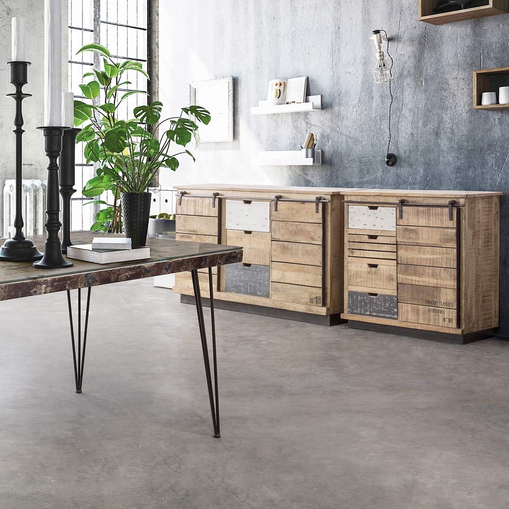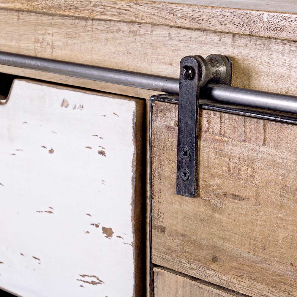 Sideboard aus Mangoholz, Stahl mit 2 Türen und 3 Schubladen.