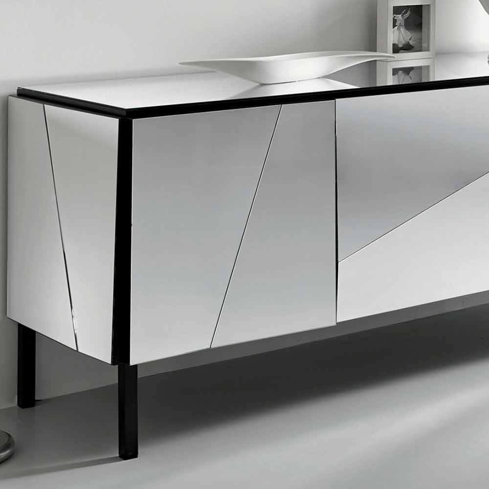 Hergestellt mit einer Struktur und Füßen aus mattschwarz lackiertem Holz, ist der Spiegeleffekt dank der Glasverkleidung mit konkaven und konvexen Spiegeln vollkommen , die ihn elegant und raffiniert machen und der Umgebung einen Hauch von Meisterschaft und Gastfreundschaft verleihen.