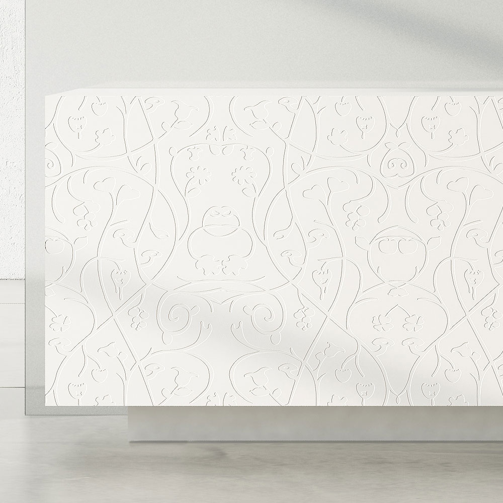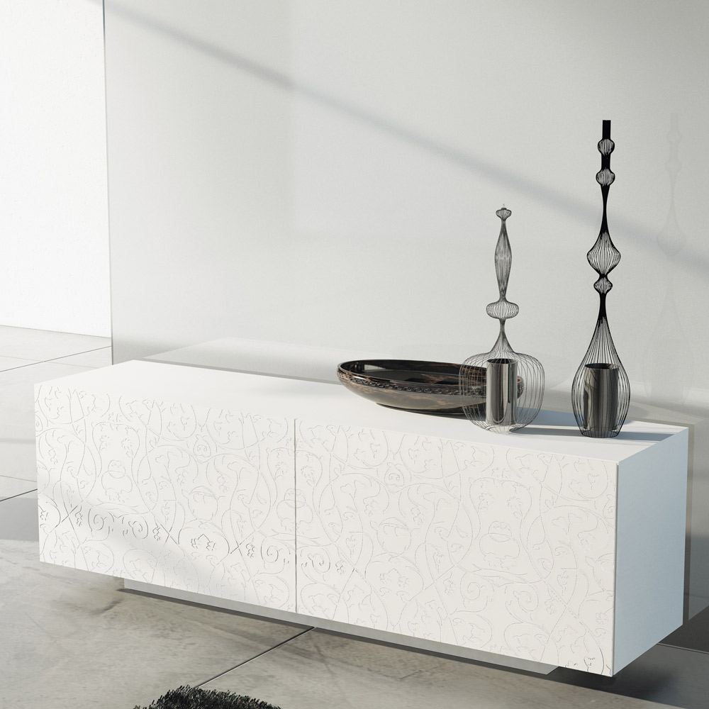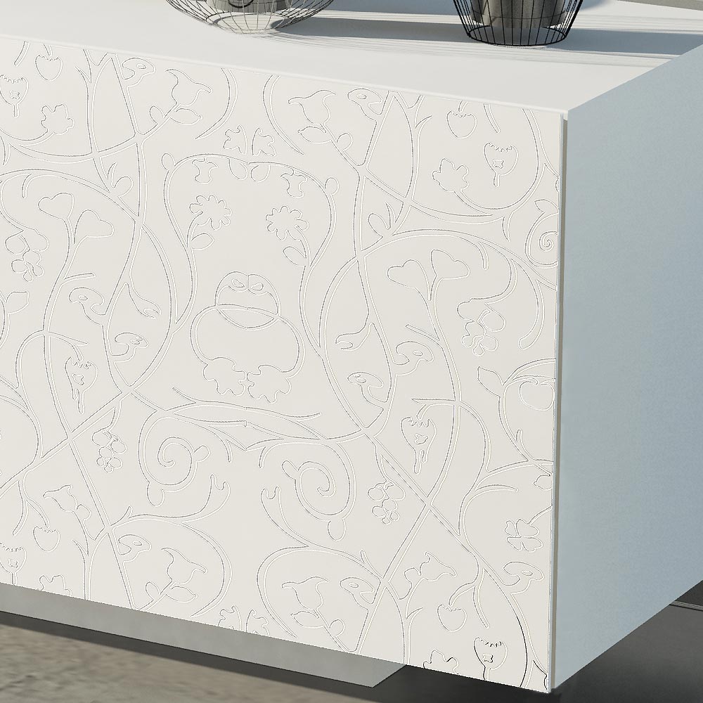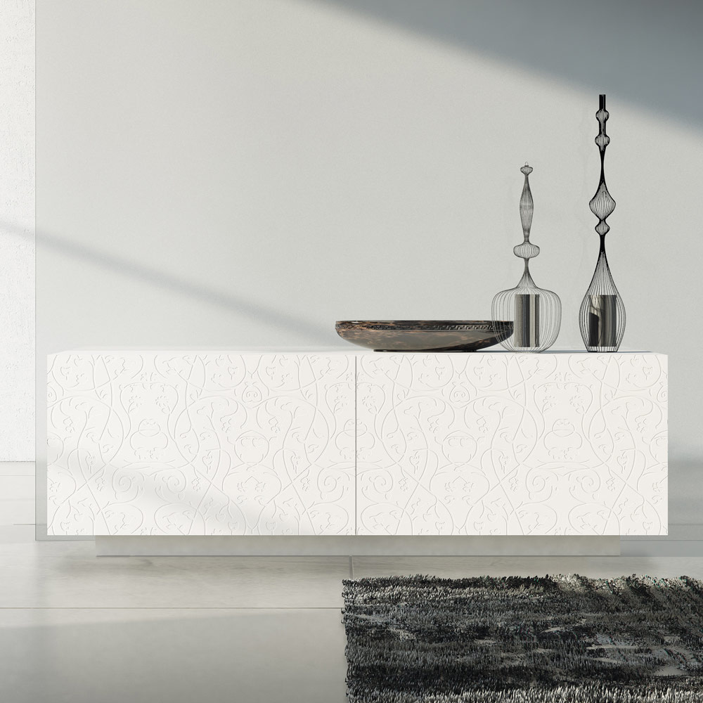 Modernes Sideboard mit weiß matt lackierterMDF- Struktur, bestehend aus 2 koplanaren Schiebetürendie hohe Funktionalität und Praktikabilität garantieren und vom lackierten Sockel , der viel Stabilität bietet. Dieses Produkt ist voller Geschmack und Design dank seiner eleganten und raffinierten Oberflächen und der Basrelief-Dekoration der Türen, die sie in ihrer Art einzigartig machen.Die verschiedenen Materialien, die für die Konstruktion verwendet werden, bieten eine hohe Qualität und Beständigkeit im Laufe der Zeit und verleihen dem Produkt eine einzigartige und unvergessliche Note.