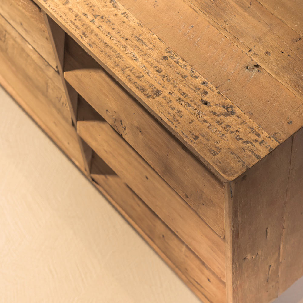Sideboard für den Innenbereich aus recyceltem Holz in natürlicher Kaffeefarbe mit Fensterladenfronten, 2 mittleren Türen und 6 seitlichen Schubladen . Dieses Einrichtungsset ist buchstäblich einzigartig , gerade weil es die besondere Geschichte der gelebten Materie verkörpert. Die Verarbeitung erfolgt größtenteils nach handwerklichen Verfahren . Jeder Kratzer und jede Unvollkommenheit, jede Narbe im Holz zeugt von der Originalität einer Vergangenheit, die neues Leben annimmt. Das legal aus alten Artefakten, Booten und verlassenen Gebäuden recycelte Tropenholz wird fachmännisch behandelt und gebürstet, um Würde und Glanz wiederzuerlangen. Dieses Produkt kombiniert die Essenz des rustikalen Geschmacks mit den Formen des zeitgenössischen Designs und einigen Details des industriellen Stils .