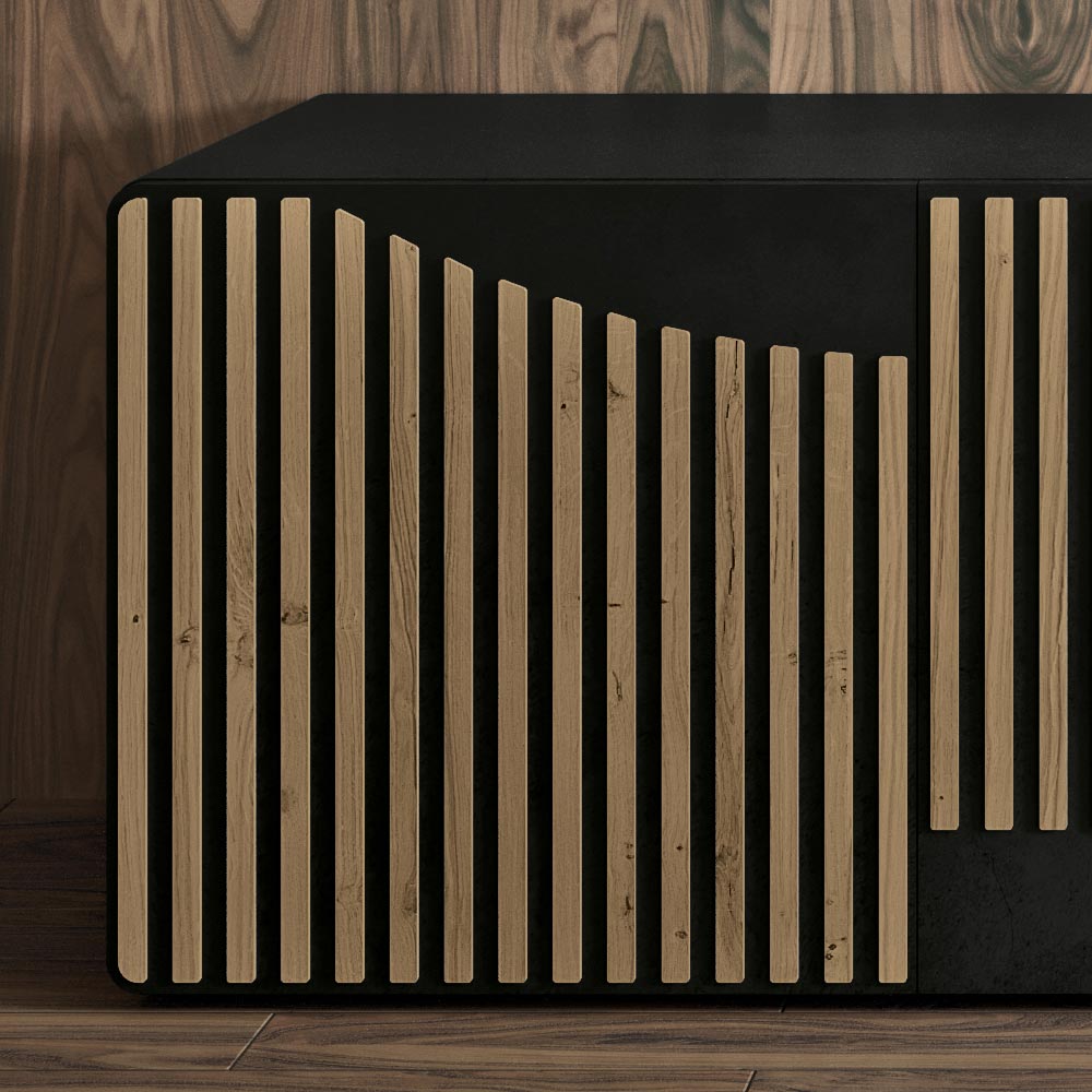Wohnzimmer-Sideboard mit 3 Türen mit vertikalen Lamellen mit anthrazitfarbener Oberfläche, 3 Innenregalen aus MDF, Sockel aus Eisen, Rückwand aus massivem Mehrschichtholz , Türen aus anthrazitfarbenemMDF und Lamellen aus massivem Eichenholz mit nordischer geknoteter Eichenoptik , vollständig hergestellt in Italien . Das Produkt ist Teil der neuen Linie moderner Produkte, die mit Respekt vor der Natur hergestellt werden. Dieses elegante Sideboard zeichnet sich durch die Funktionalität und hohe Qualität italienischer Handwerkskunst aus. Ein vielseitiges und originelles Design , das für verschiedene Verwendungszwecke in verschiedenen Bereichen des Hauses konzipiert ist und die Einrichtung auf exklusive Weise je nach Ihrem Geschmack und Bedarf vervollständigt.