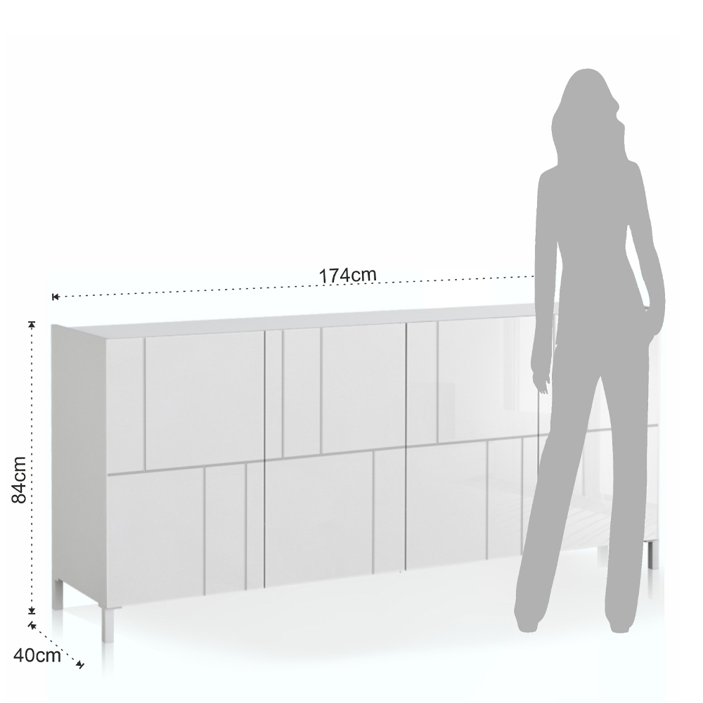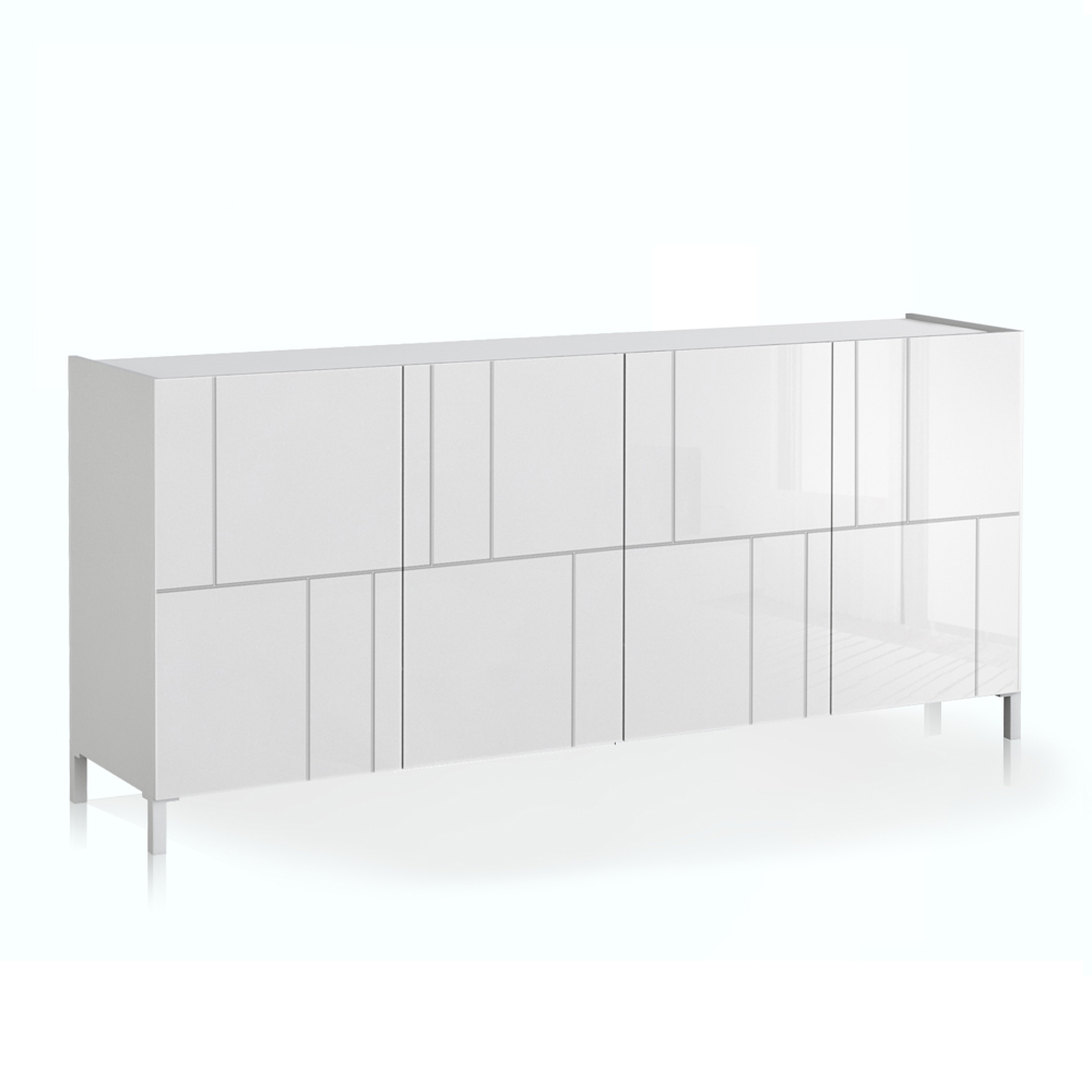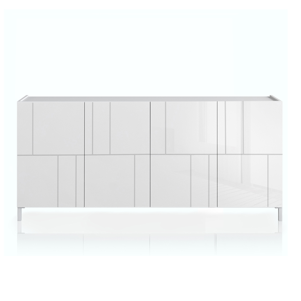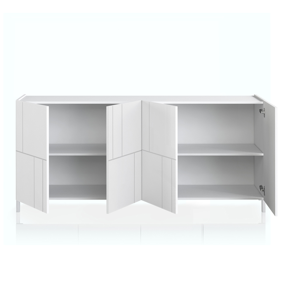 Wohnzimmer-Sideboard aus ökologischen Spanplatten . 15/16 mm glänzend weiß lackiert, mit 4 Siebdruck-Flügeltüren und verstellbaren Füßen , komplett . Dieses Möbelstück eignet sich perfekt, um dem Raum eine elegante und zeitlose Atmosphäre zu verleihen. Es handelt sich um einen funktionalen und praktischen Gegenstand, der dank der Türen hilft, Gegenstände in Ordnung und organisiert zu halten, sodass man sie immer griffbereit hat. Die für die Herstellung ausgewählten Materialien garantieren große Widerstandsfähigkeit und Qualität.