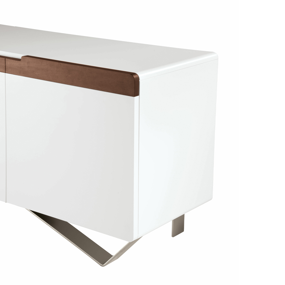 Wohnzimmer-Sideboard mitFüße aus vernickeltem Eisen, Korpus und Türen aus weißem MDF mit Griff aus massivem Tulpenholz,Canaletto- Finish, vollständig in Italien hergestellt.Komplett mit praktischen Innenregalen . Das Produkt ist Teil der neuen Linie moderner Produkte, die mit Respekt vor der Natur hergestellt werden. Dieses elegante Sideboard zeichnet sich durch die Funktionalität und hohe Qualität italienischer Handwerkskunst aus. Ein vielseitiges und originelles Design , das für verschiedene Verwendungszwecke in verschiedenen Bereichen des Hauses konzipiert ist und die Einrichtung auf exklusive Weise je nach Ihrem Geschmack und Bedarf vervollständigt.