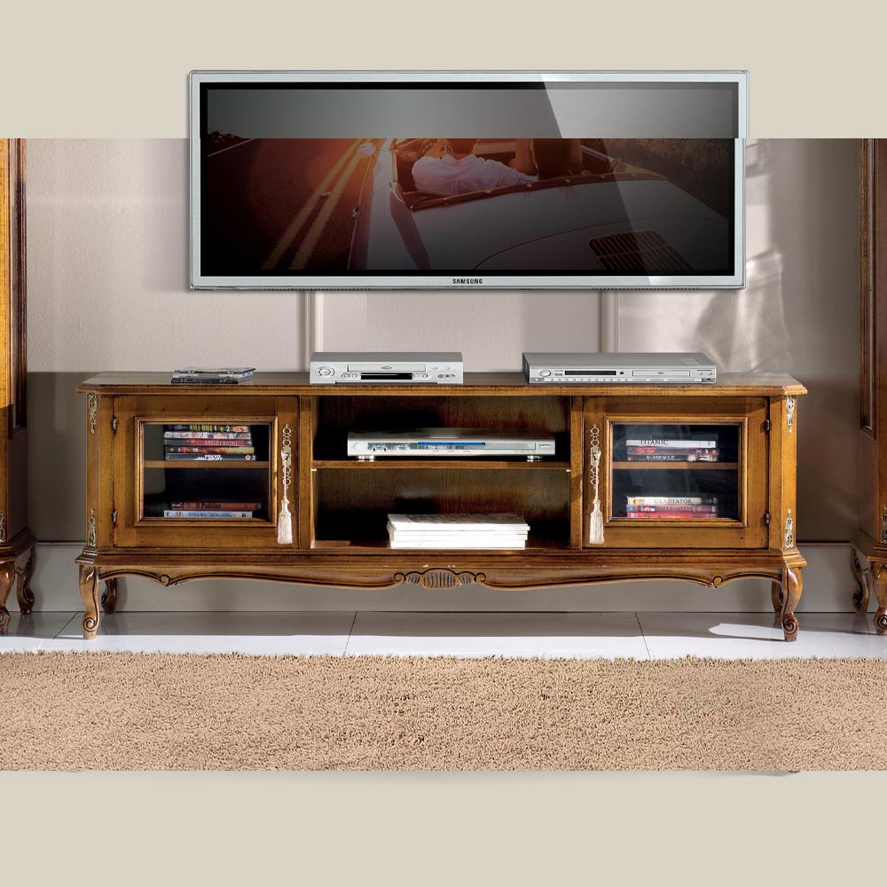 Dieser TV-Ständer aus edlem Bassano-Nussbaumholz verleiht Ihrem Wohnzimmer einen Hauch von klassischem Stil . Das praktische Möbelstück verfügt über zwei Türen und zwei Fächer. Einzigartig und raffiniert, wird es vollständig in Italien gefertigt und von erfahrenen Handwerksmeistern mit Geschick und Eleganz vollendet. Für die Herstellung werden hochwertige Materialien verwendet und die sorgfältige und professionelle Handarbeitverwendet, die Made in Italy -Produkte auszeichnet.