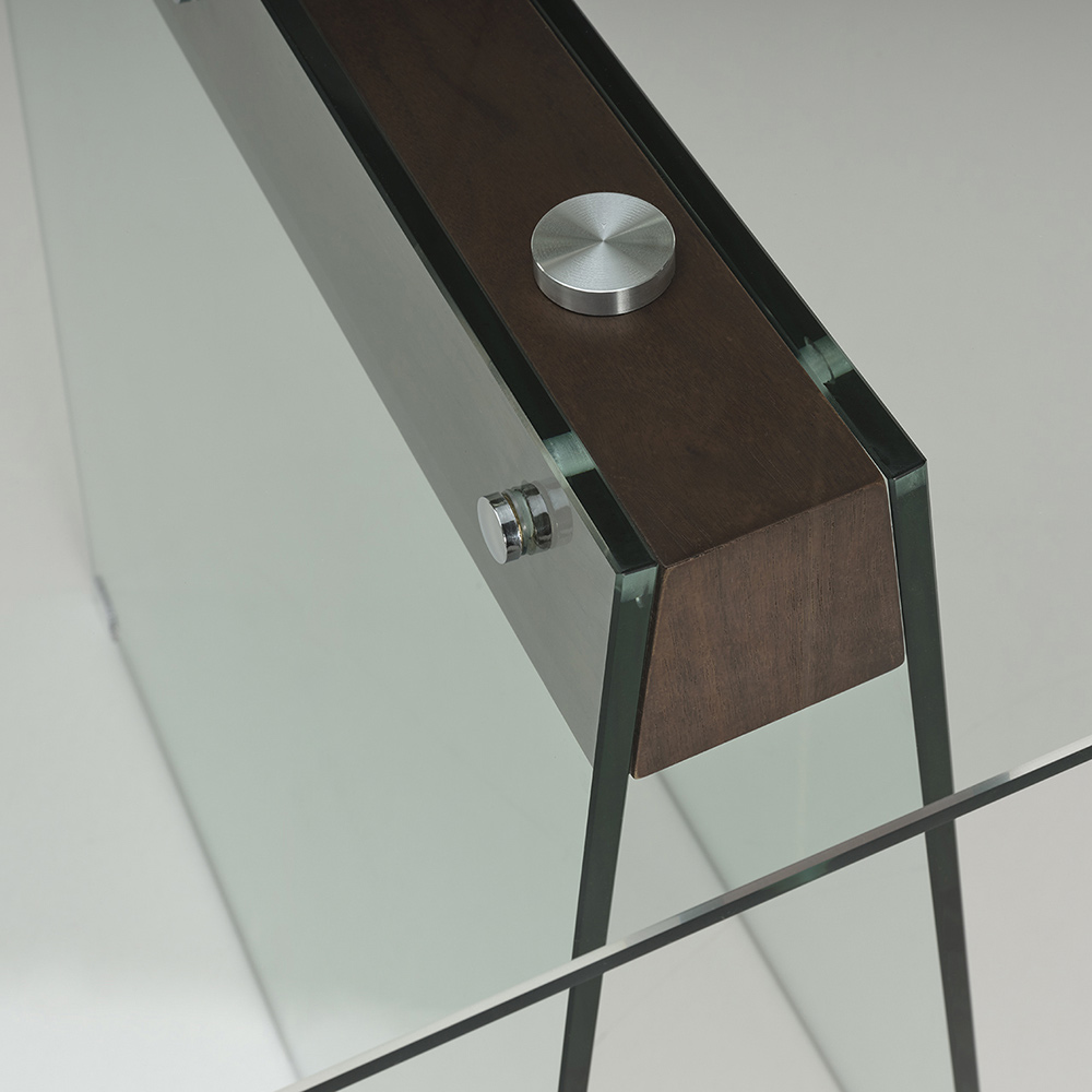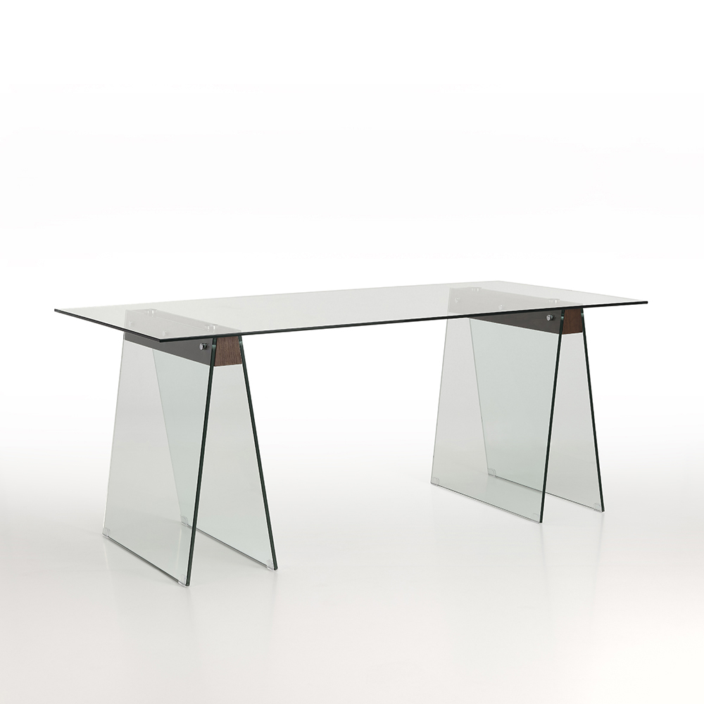 Losanna ist ein Tisch im modernen Stil mit Beinen aus Klarglas und einer 12 mm dicken Klarglasplatte mit Einsätzen aus walnussfarbenem MDF. Dank der Materialkombination ist es ein perfektes Einrichtungsaccessoire für alle Ihre Räume.