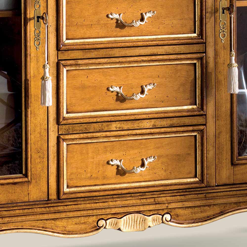 Wohnzimmervitrine im klassischen Stil aus wertvollem Bassano-Nussbaum und Holz mit Antikgold-Finish , mit 2 Glastüren und 5 Schubladen. Elegant und zeitlos ist diese Vitrine im klassischen Stil ideal, um beeindruckende Umgebungen zu schaffen. Vollständig in Italien hergestellt und von erfahrenen Handwerksmeistern handgefertigt, vollendet mit Weisheit und Geschmack für Eleganz. Die Herstellung erfolgt unter Verwendung hochwertiger Materialien und mit der größten Sorgfalt und Professionalität, die die Produkte Made in Italyauszeichnet .
