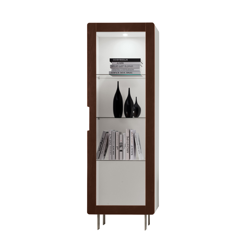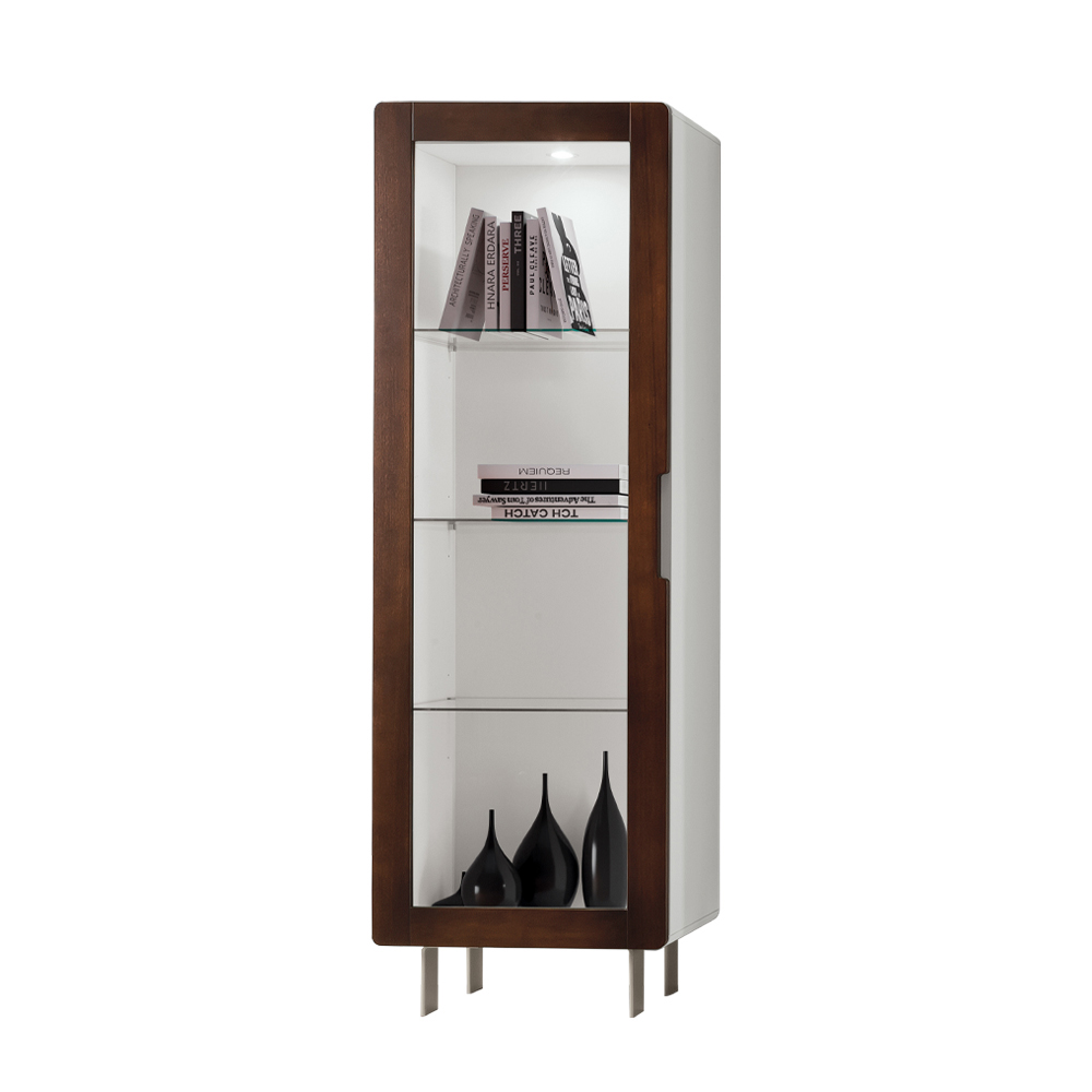 Die Vitrine für das Wohnzimmer zeichnet sich durch ihr schlichtes und essentielles Design aus und eignet sich perfekt für die Einrichtung eines Wohnzimmers, eines Flurs, eines Schlafzimmers und aller anderen Räume. Diese Vitrine besteht aus Eisenfüßen mit Nickel-Finish , einer MDF- Schale in Weiß-Finish und einer Glastür mit Außenrahmen aus massivem Tulpenholz mit Canaletto -Finish und 3 internen Glasböden.