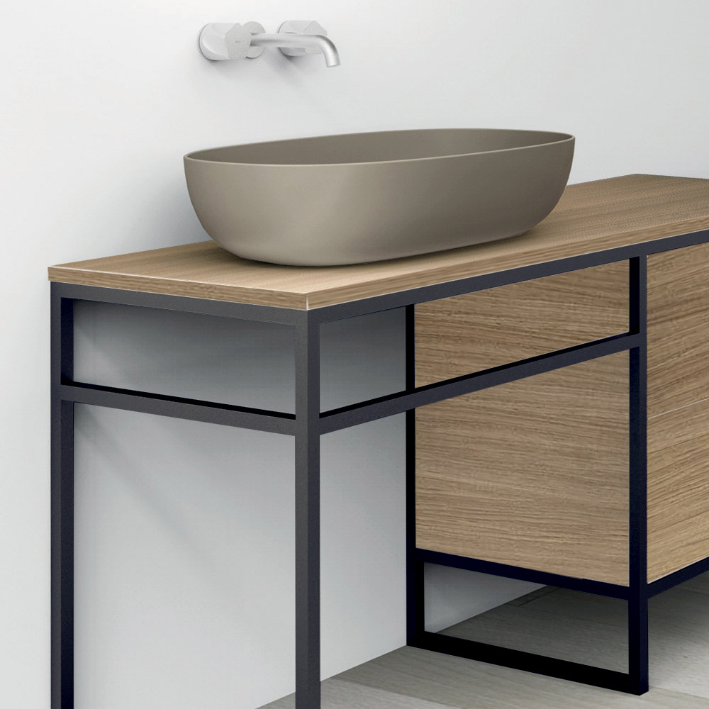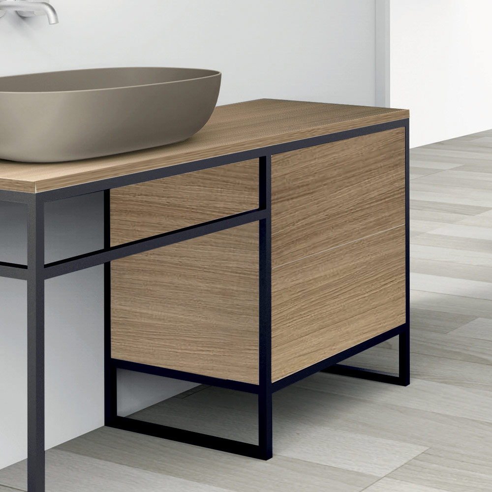 Diese Badmöbellinie zeichnet sich durch eine Struktur aus einem dünnen mattschwarz lackierten Metallprofil aus, das die Türen aus Eichen-Ökoholz einrahmt und eine harmonische Kombination aus vollen und leeren Räumen schafft. Die Metalloberflächen der Türen unterstreichen den industriellen Stil dieser eleganten Komposition mit Waschbeckenunterteil mit seitlichen Schubladen, Aufsatzwaschbecken und Spiegel.