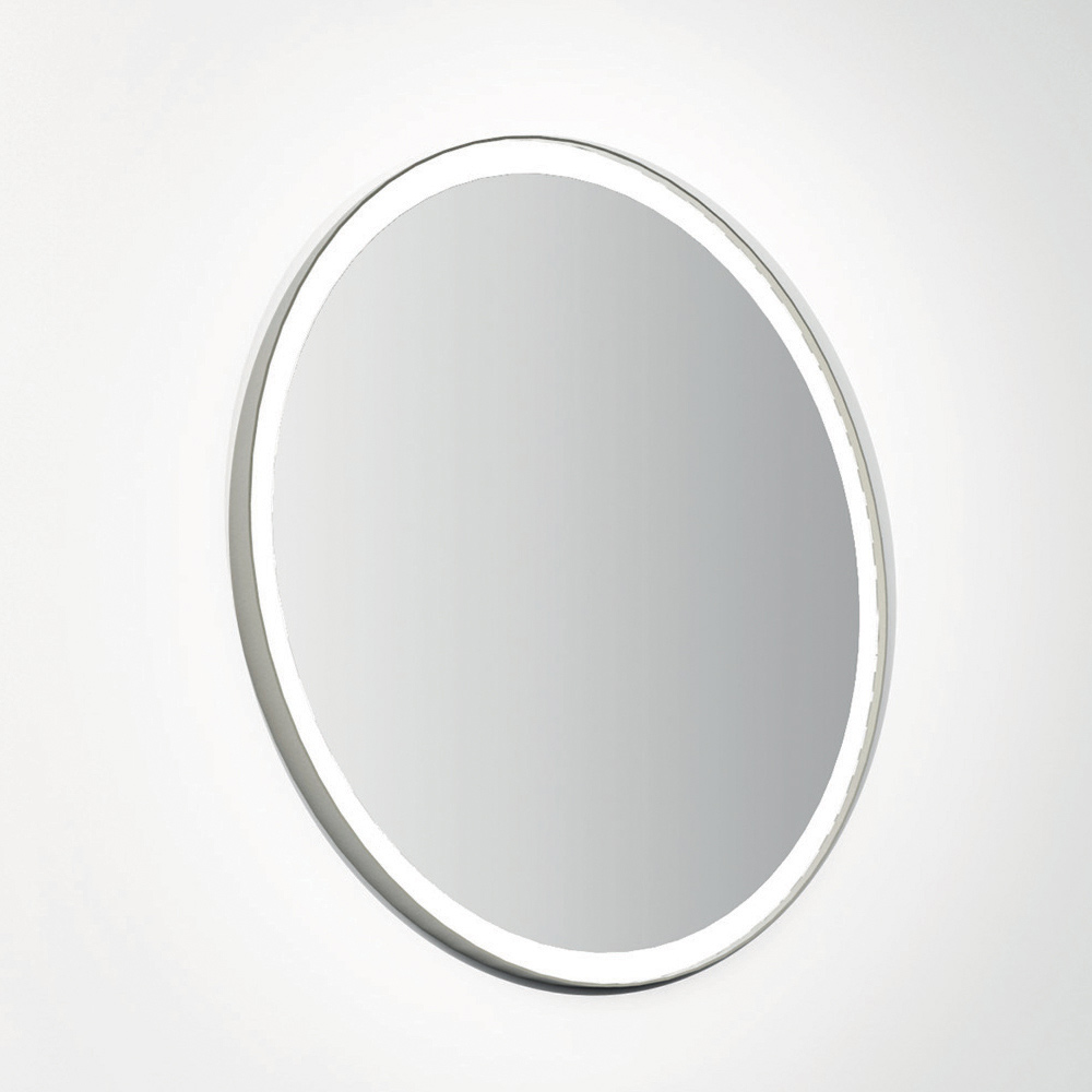 Abgerundet wird die Komposition durch den runden Spiegel mit mattschwarz lackiertem Metallrahmen und praktischer LED-Beleuchtung .