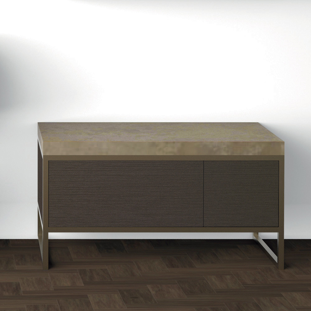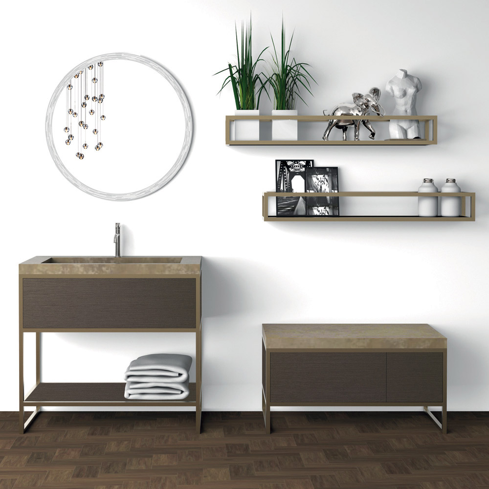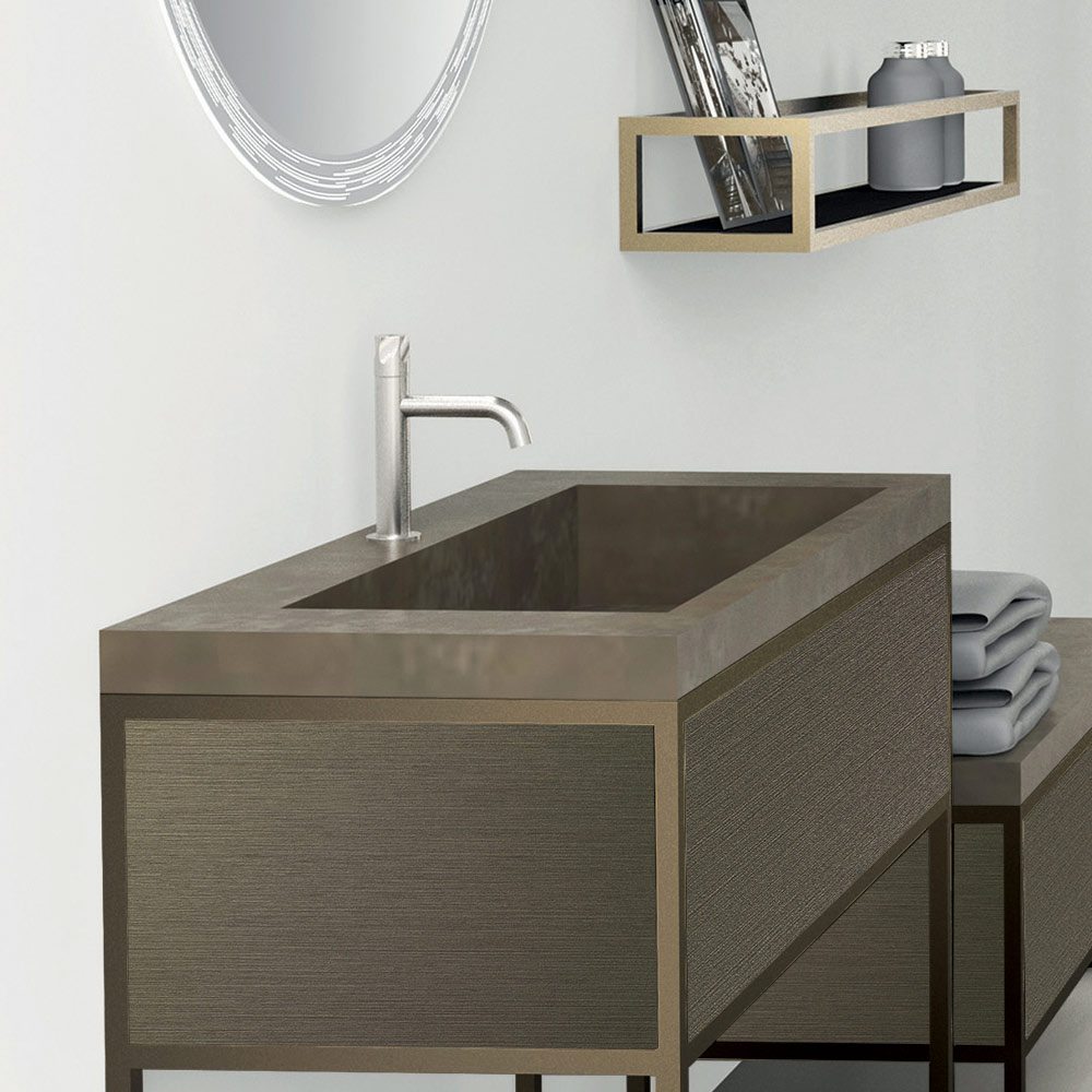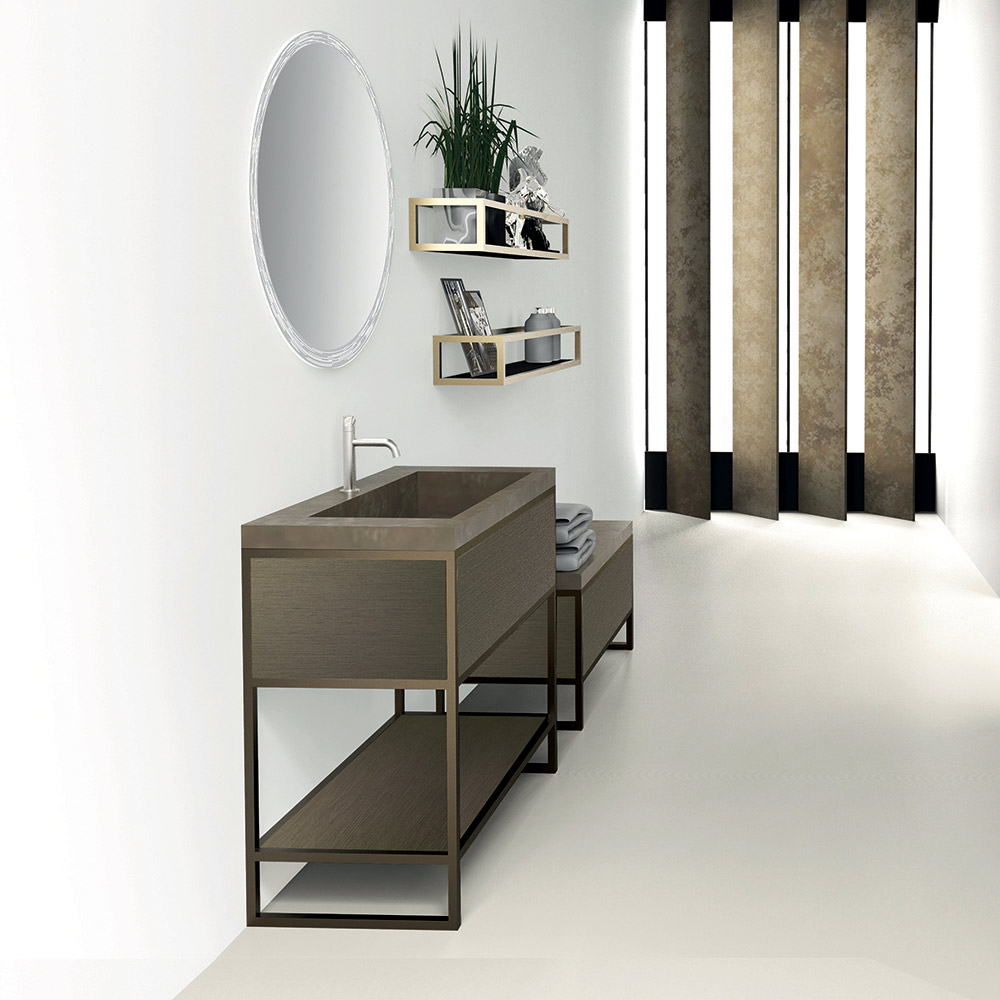 Diese Badmöbellinie zeichnet sich durch eine Struktur aus einem dünnen Metallprofil in Antikbronze-Optik aus, das die Türen aus Metallbronze-Ökoholz einrahmt und eine harmonische Kombination aus vollen und leeren Räumen schafft. Die Metalloberflächen der Türen unterstreichen den industriellen Stil dieser eleganten Komposition.