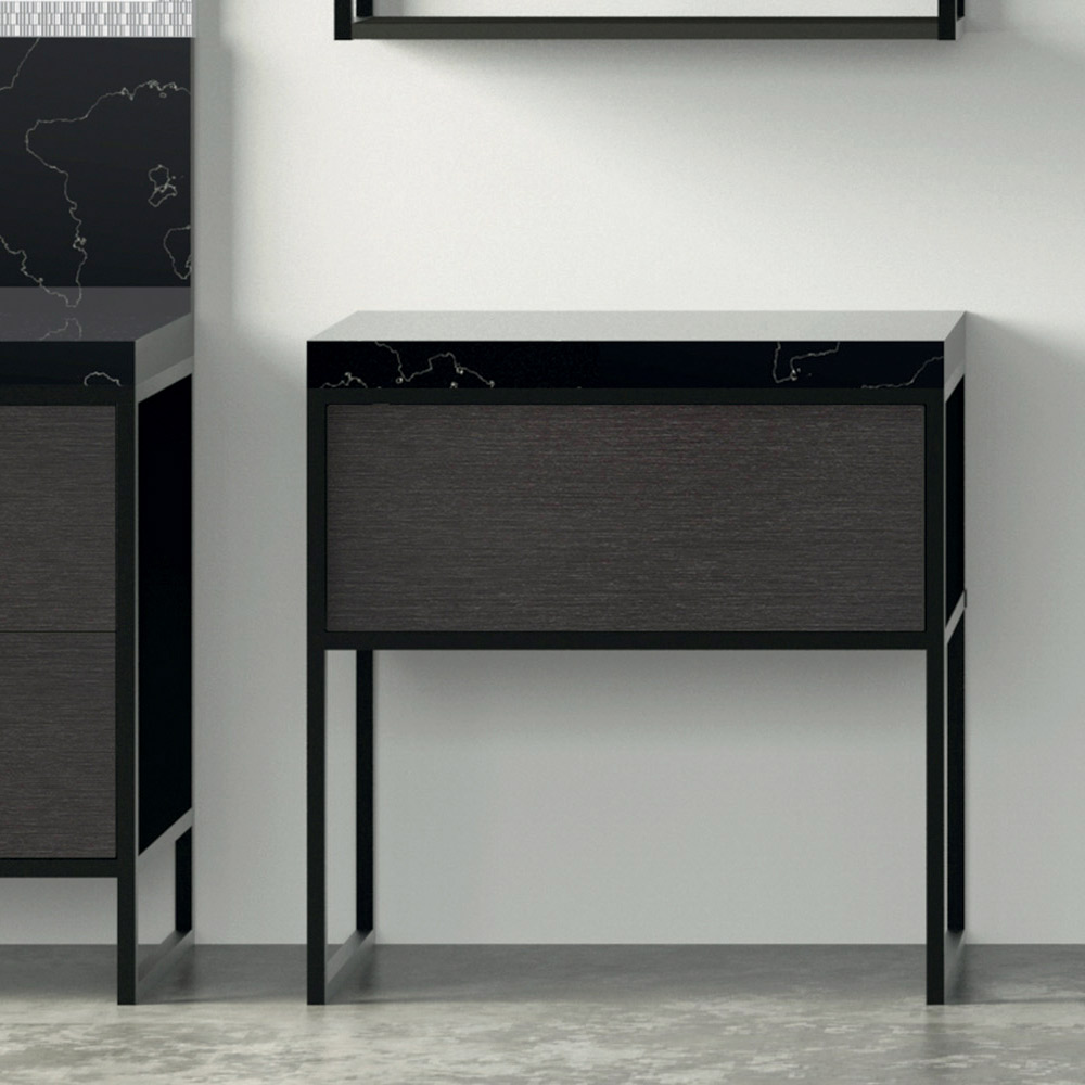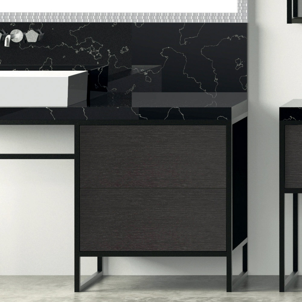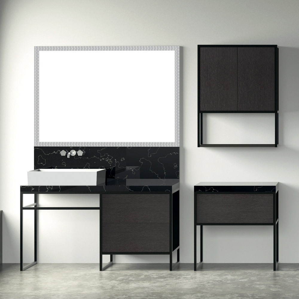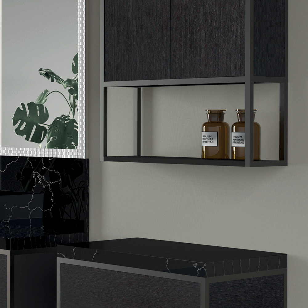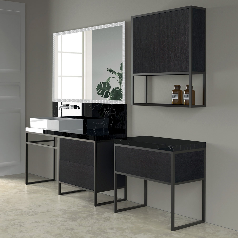Diese Badmöbellinie zeichnet sich durch eine Struktur aus einem dünnen mattschwarz lackierten Metallprofil aus, das die schwarzen Metalltüren aus Ökoholz einrahmt und eine harmonische Kombination aus vollen und leeren Räumen schafft. Die Metalloberflächen der Türen unterstreichen den industriellen Stil dieser eleganten Komposition mit Waschtischunterbau, Waschbecken, Seitenkommode, Spiegel und Hängeschrank.