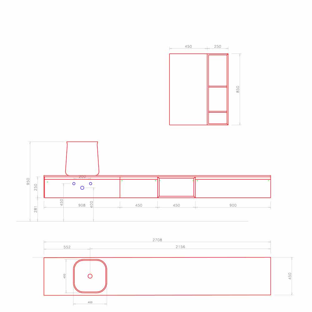 Die Besonderheit dieser Zusammensetzung ist die Silhouette des hohen Waschbeckens auf der Arbeitsplatte, die sich durch die nach außen öffnende Kante auszeichnet, die an die Form einer Tulpe erinnert, im Gegensatz zur Linearität der darunter liegenden Fächer, wodurch die Formen gemildert werden.