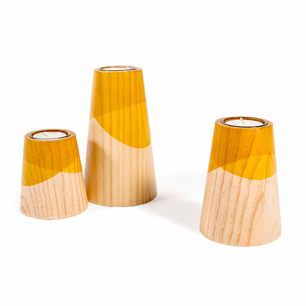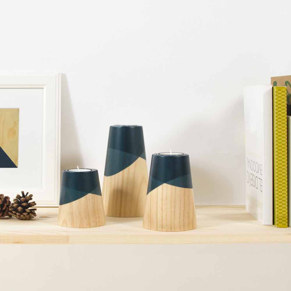 Zusammensetzung der Kerzenhalter aus massiver Kiefer mit gebeizten Details, 3 Stück.